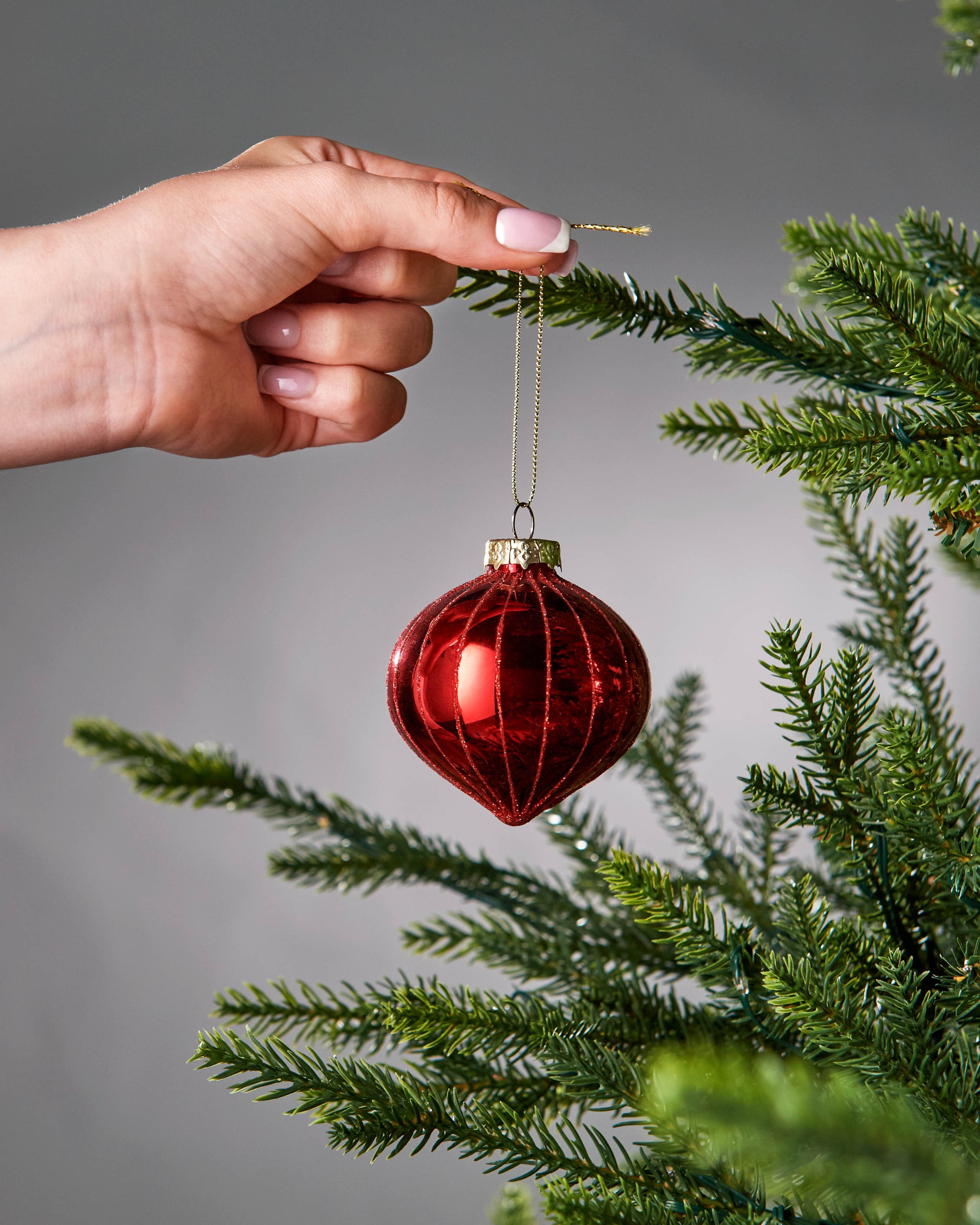 Each bauble is hand-finished in a combination of gloss, matt and glitter textures to reflect light and build depth. The rich red hue works beautifully with golds, greens or natural