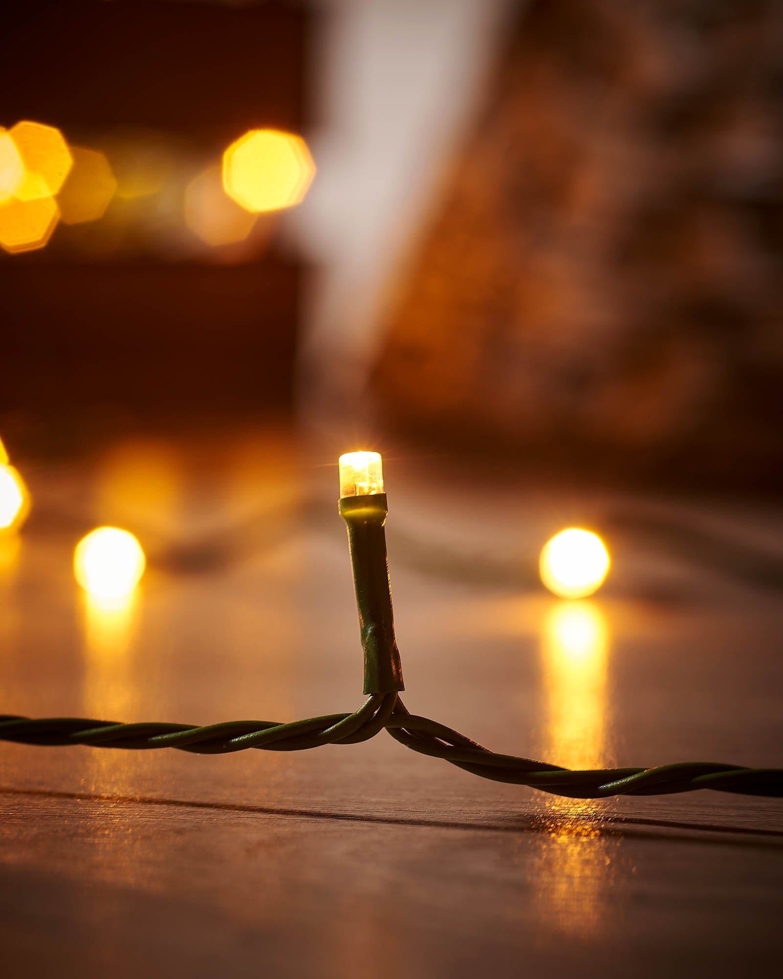 Illuminate your festive season with the 550 Warm White LED String Lights, the perfect addition to enhance the ambiance of your Christmas decorations. Featuring a green cable, they seamlessly blend with the foliage, ensuring the focus remains on their warm, inviting glow.