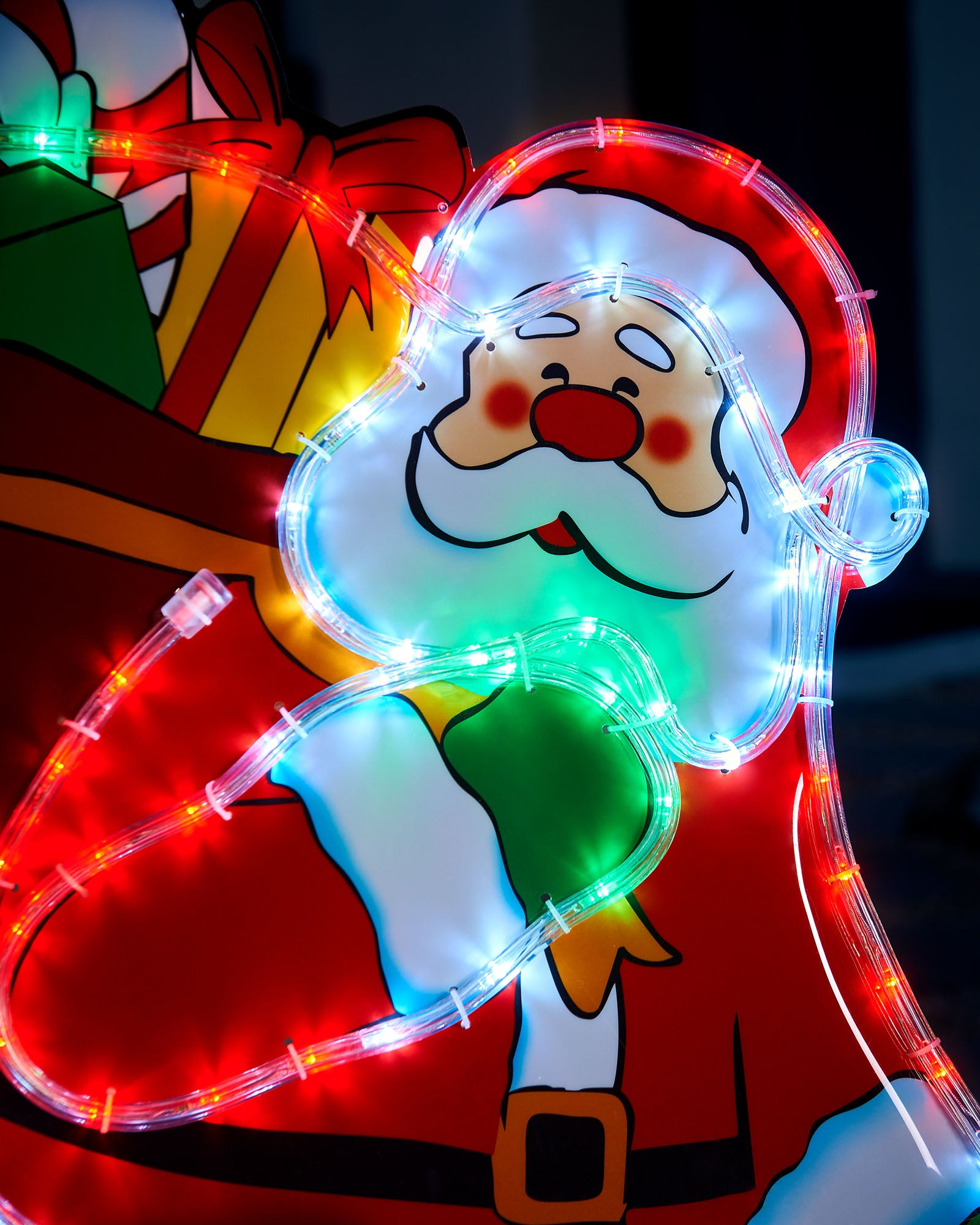 Bring seasonal character to your setup with this Santa on Chimney Rope Light Display, Multi-Coloured LEDs, 95 cm. The design features Santa with a gift sack stepping into a chimney, lit by bright multi-coloured LEDs. Fitted with a fold-out stand and hanging hoops, it’s suitable for use on fences, walls or porches. Includes a 1.5 m lead cable. Mains powered with UK plug. Keep plug dry if used outdoors.