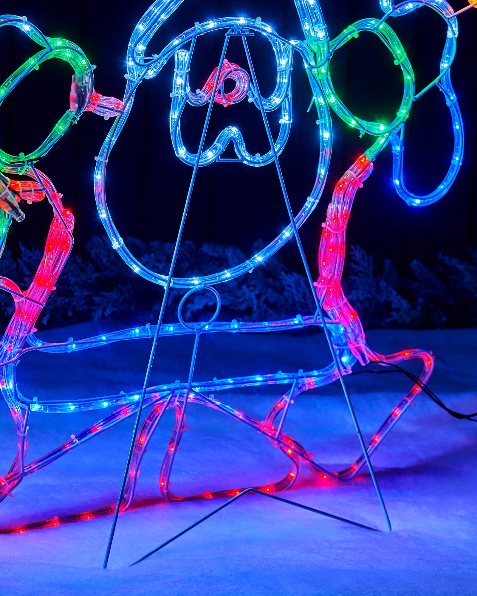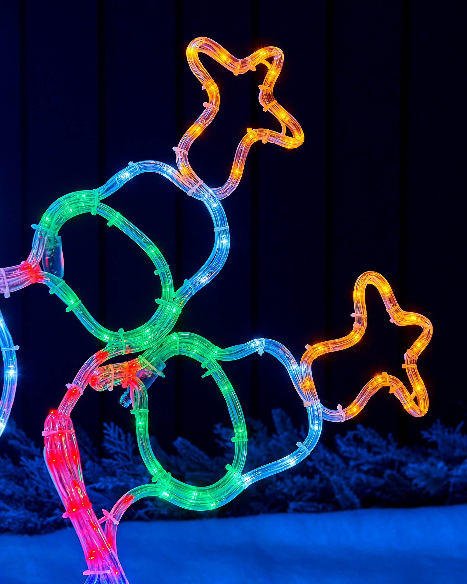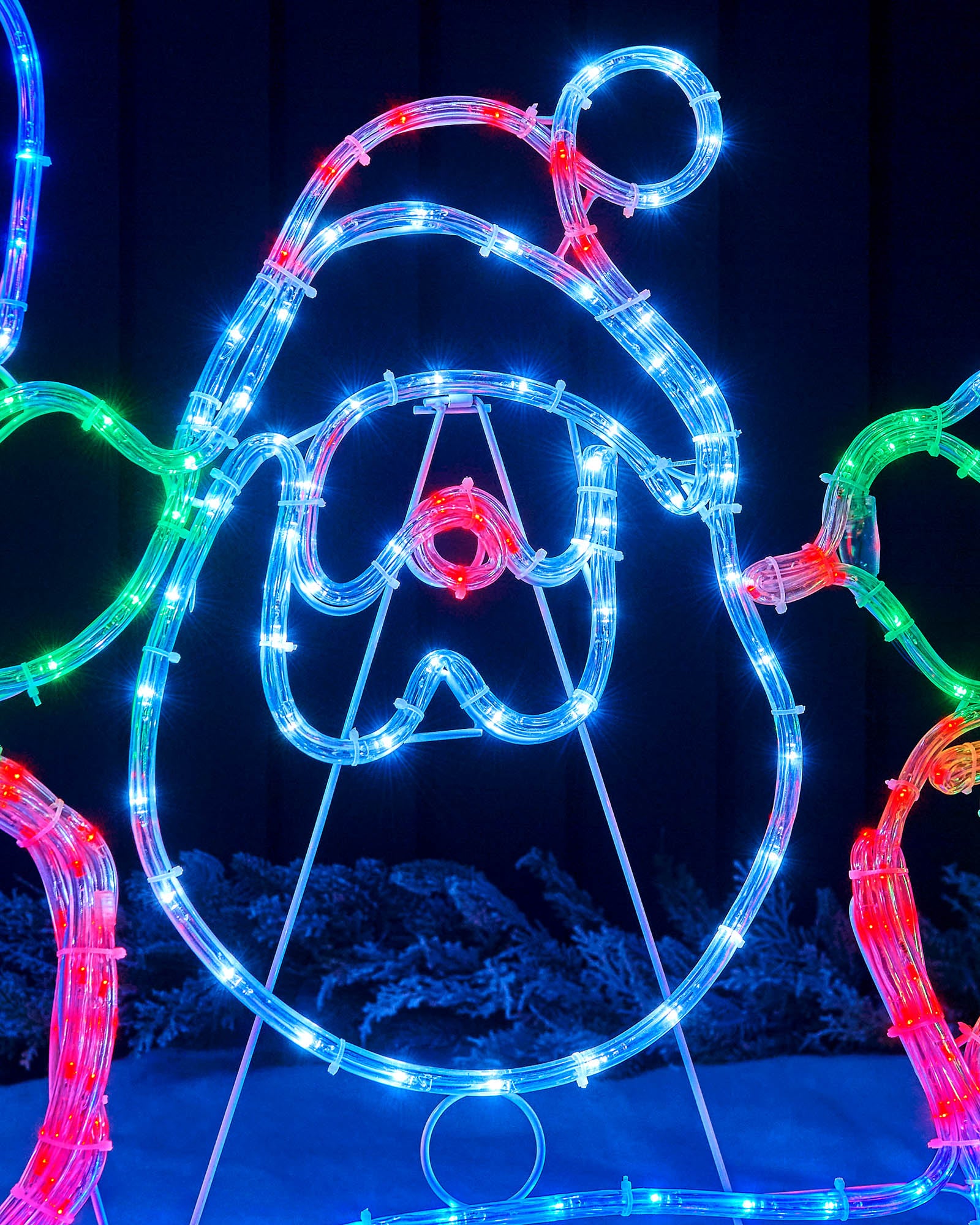 Create a lively display with this Animated Santa Rope Light Display, Multi-Coloured LEDs, 90 cm. Featuring waving and foot-tapping animation with an 8-speed light controller, it brings movement and colour to any festive space. The hinged frame can be free-standing or hung using the included hooks. Includes 1.5 m lead cable. Mains powered with UK plug. Keep plug dry if used outdoors.
