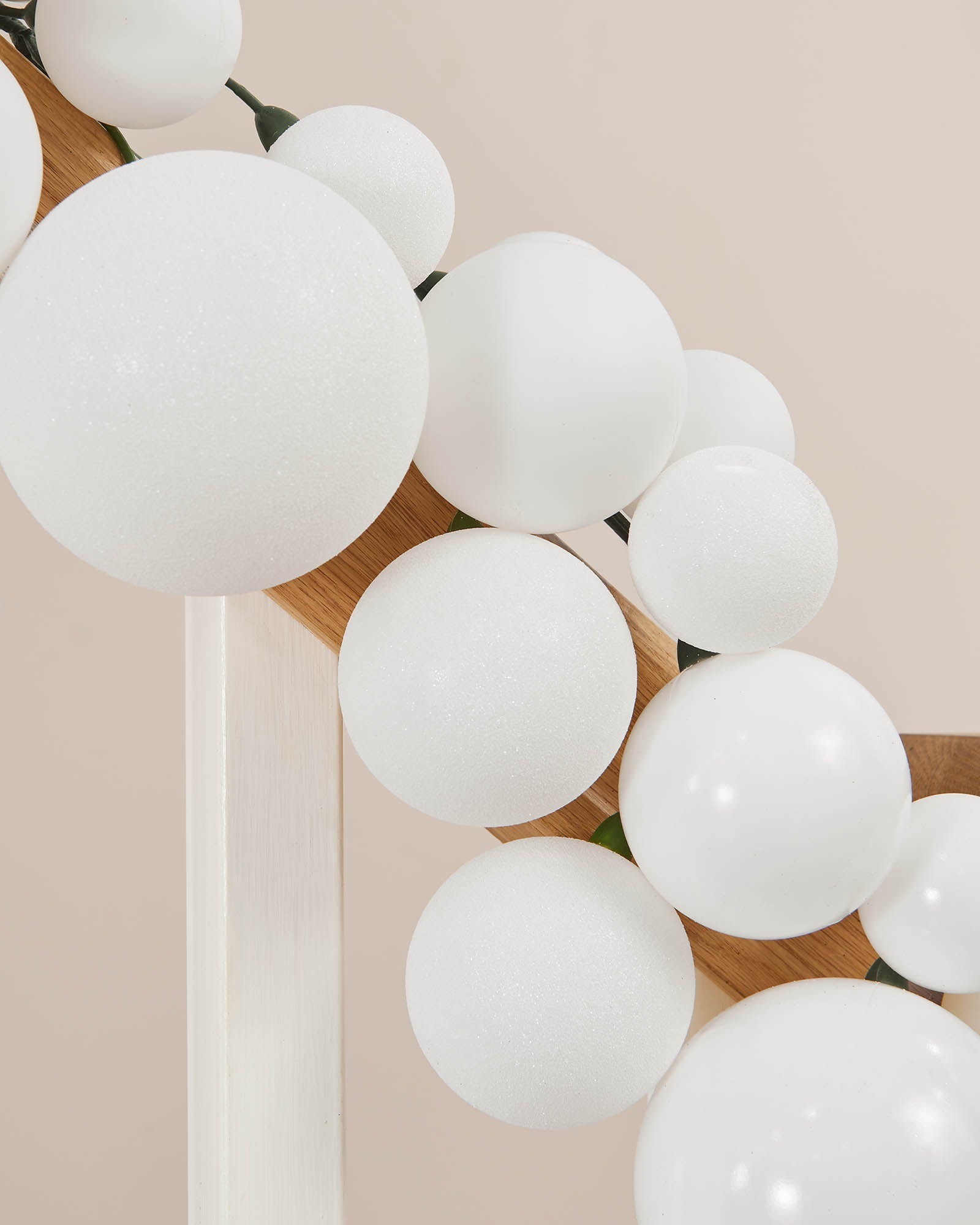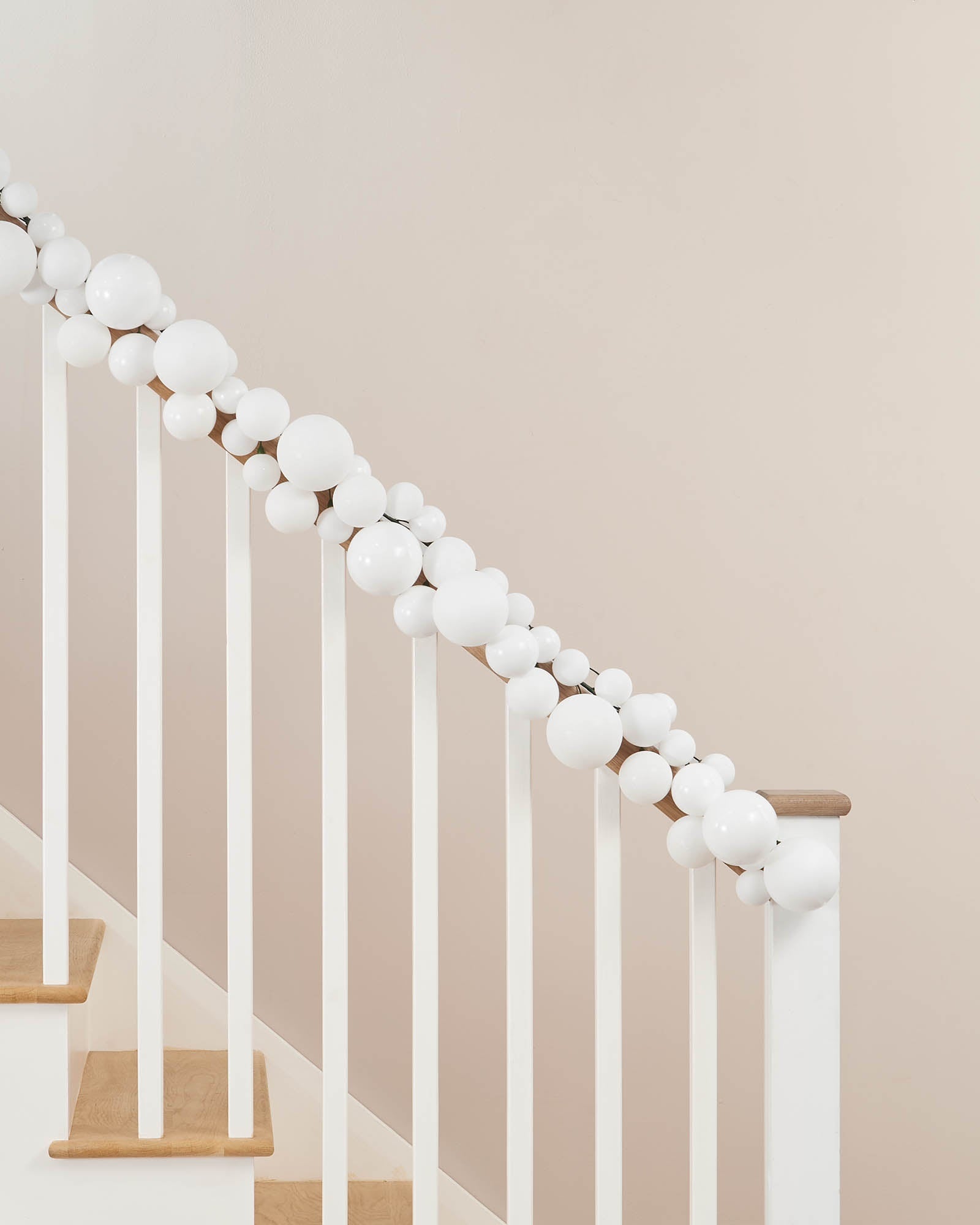Designed for use on Christmas trees and garlands, this 9 ft decoration features 84 white baubles in a mix of shiny, matt and glitter finishes. The variety of textures and sizes—50 mm, 70 mm and 100 mm—adds instant depth and balance to any festive arrangement.