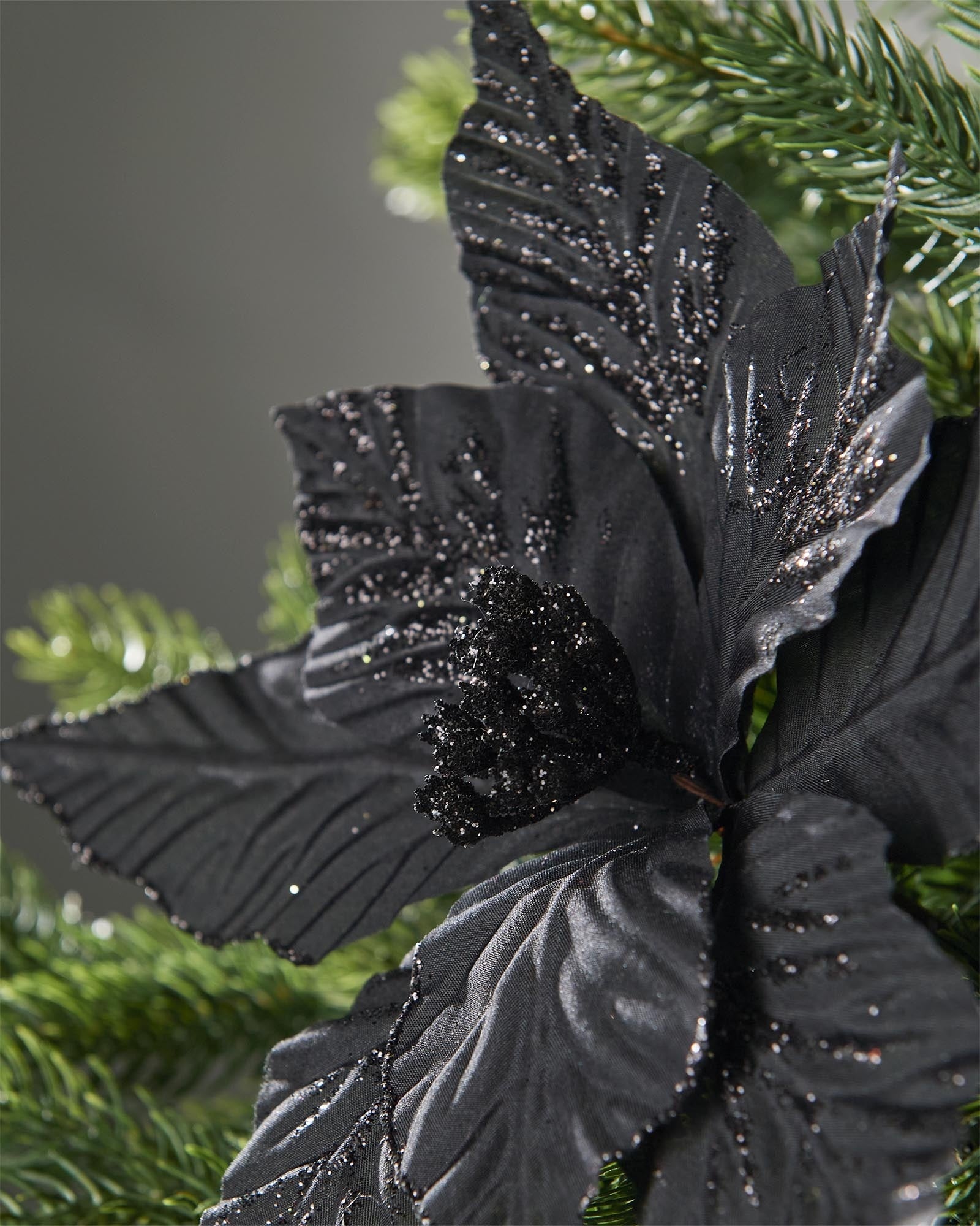 Add refined style to your festive décor with this 25 cm black poinsettia flower. Designed with soft fabric petals in deep black and finished with a glittered stigma, it offers a striking contrast when placed on Christmas trees, garlands or wreaths. The attached 20 cm stem makes it easy to secure within your seasonal arrangements year after year.