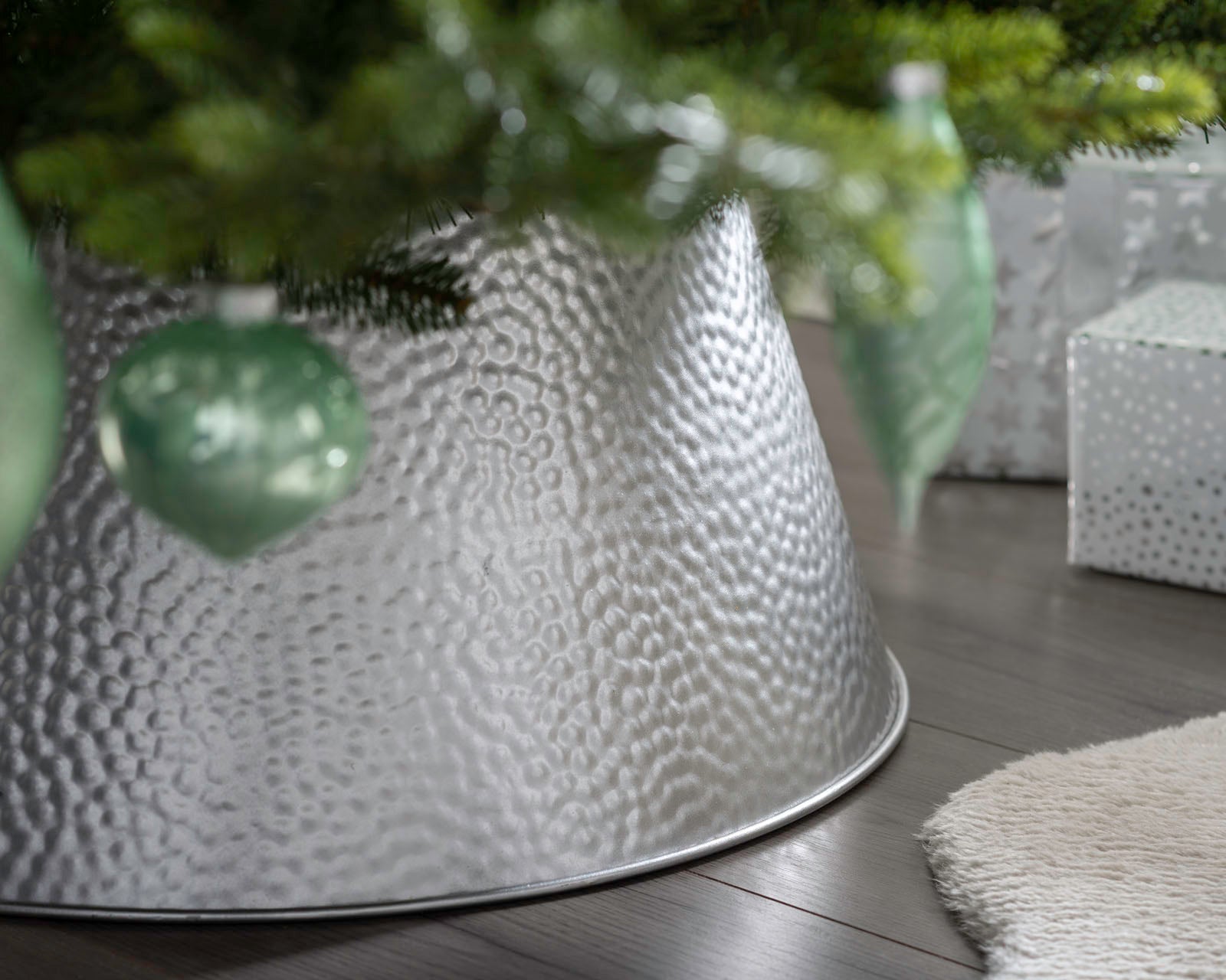 Give your Christmas tree the ideal base with this stylish silver Xmas tree collar, which has shiny hammered-effect finish. Easy to build with a flatpack design and use for any tree, real or artificial, with a diameter up to 55 centimetres. The durable metal design on this Christmas tree collar means the product will last for years to come when stored away safely.