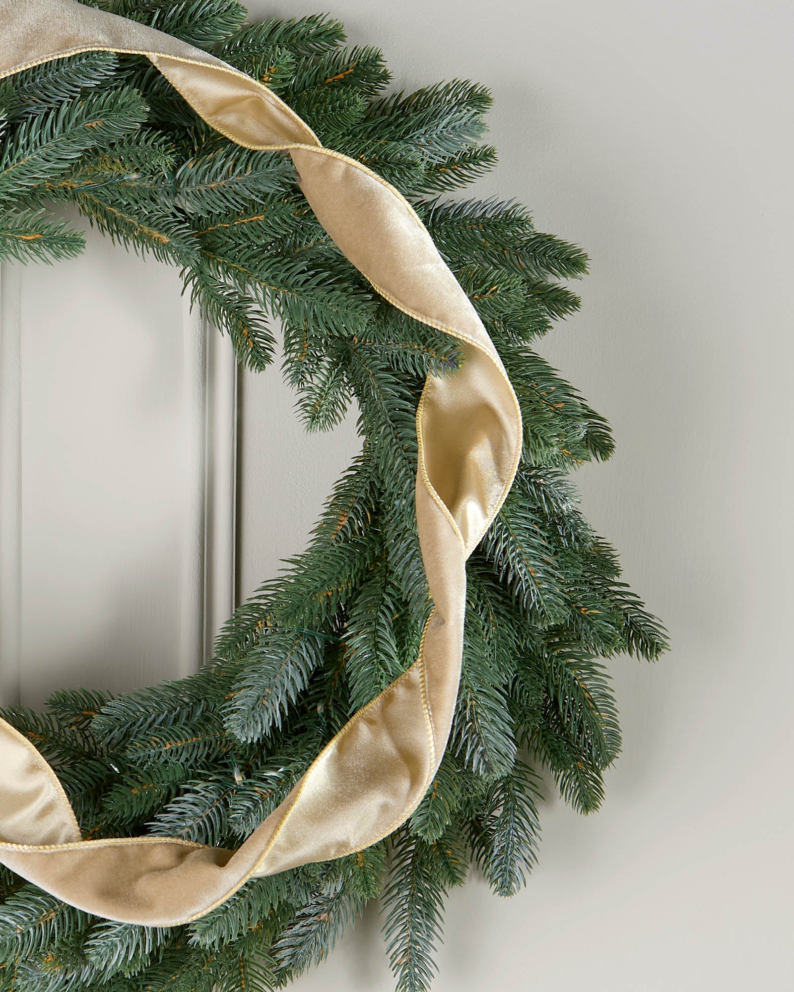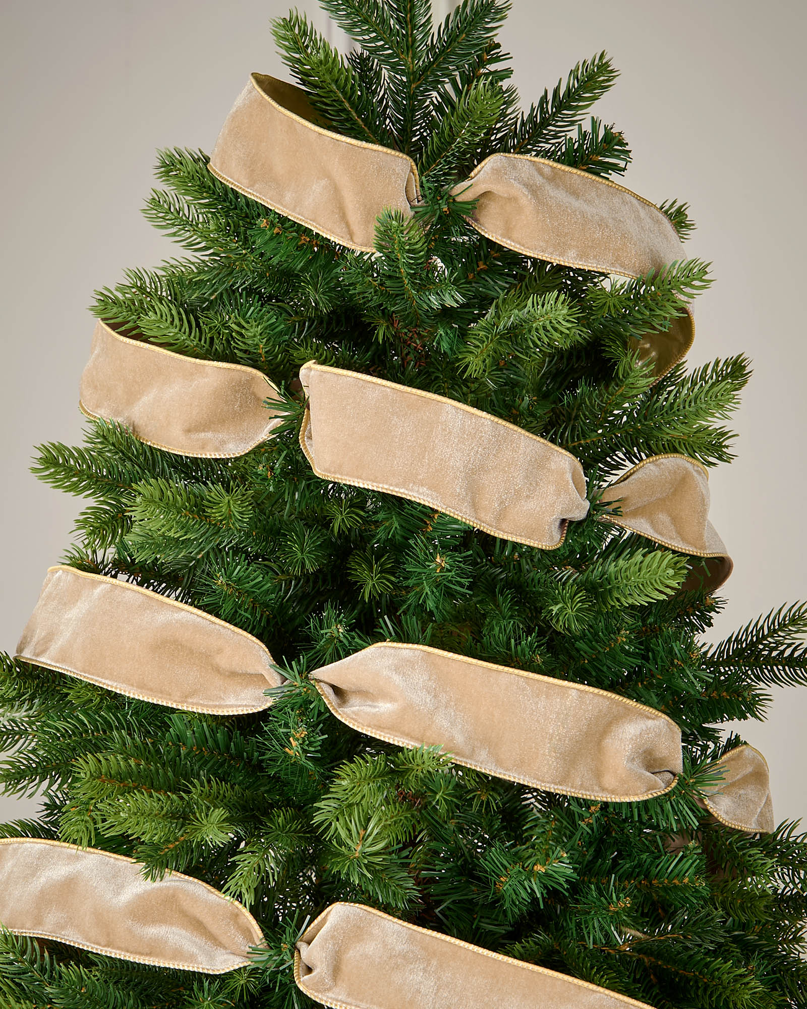 This 63mm wide ribbon features a sumptuous velvet front and a smooth satin back, both in a rich gold that brings warmth to your seasonal projects. Measuring 9 metres, this ribbon creates stunning looks in trees, garlands, and wreaths, adding a refined touch to your festive décor.