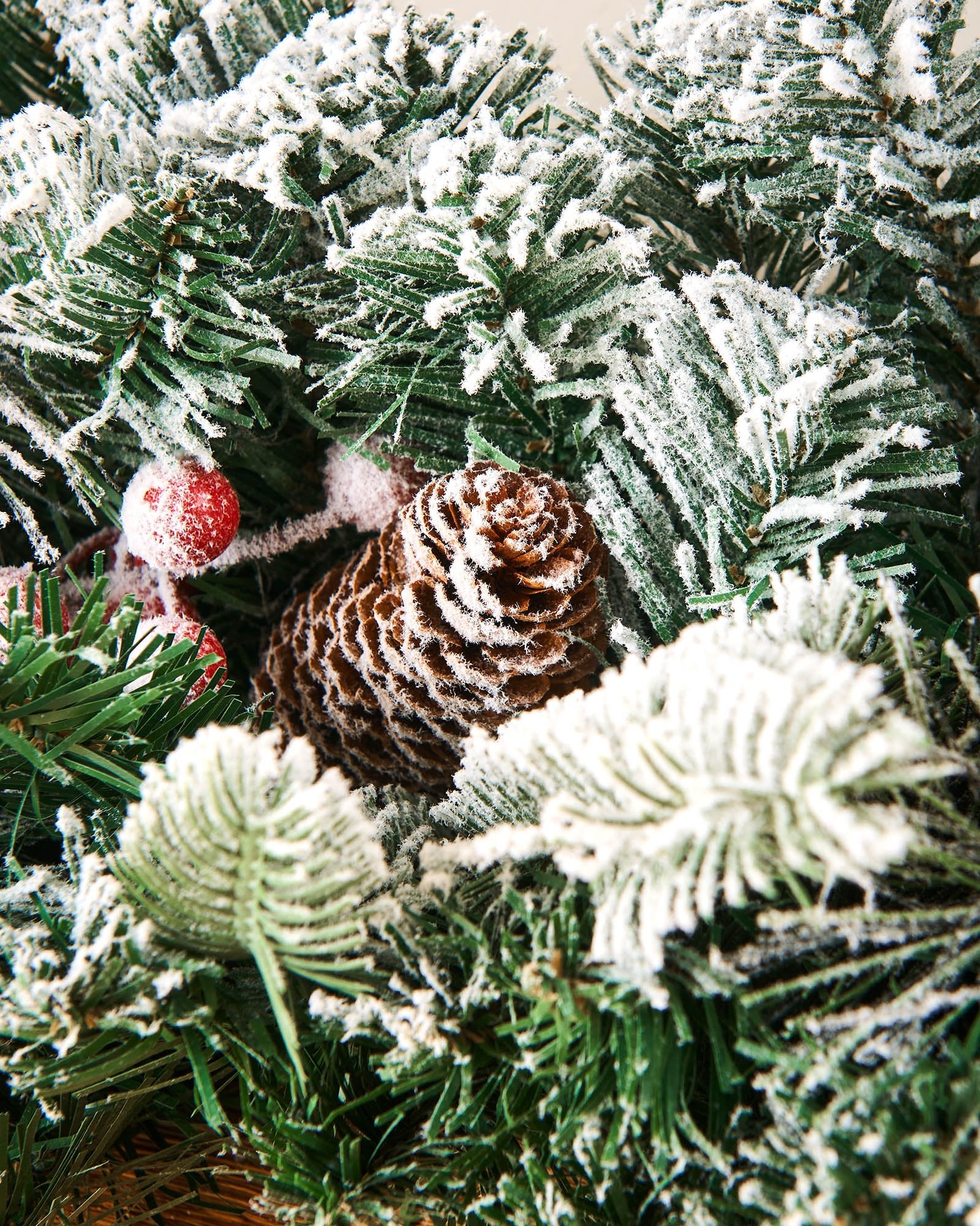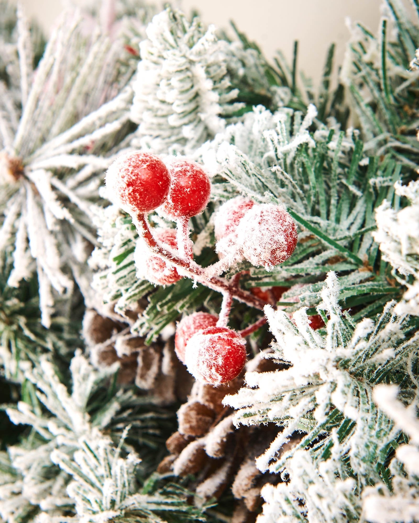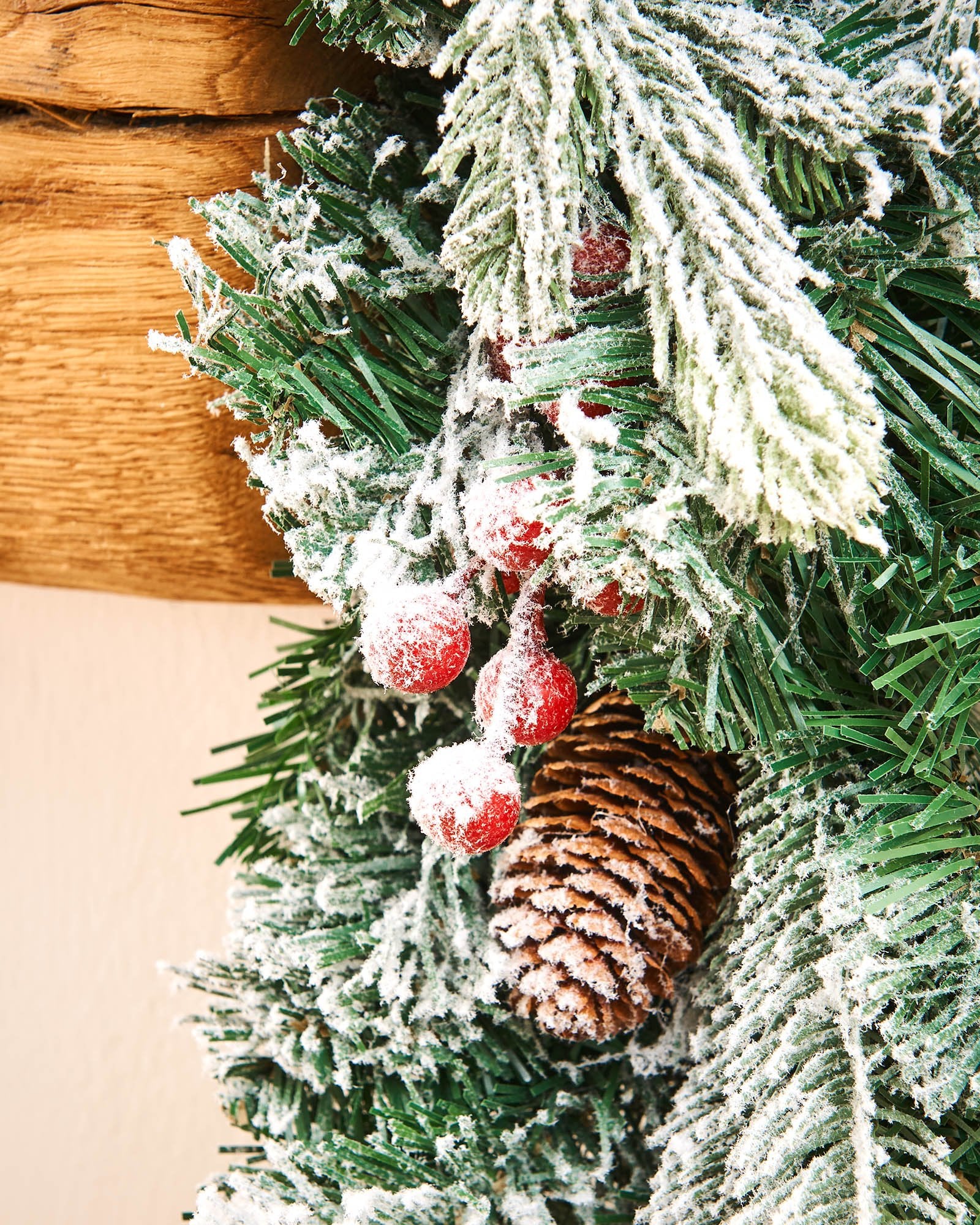 Immerse your home in the splendour of winter with this elegant 9 ft Extra Thick Mixed Pine Snow Flocked Garland. Featuring rich pine cones and berries artfully arranged among lush greenery, each branch is generously dusted with artificial snow, creating a subtle frosted finish that evokes classic seasonal charm.