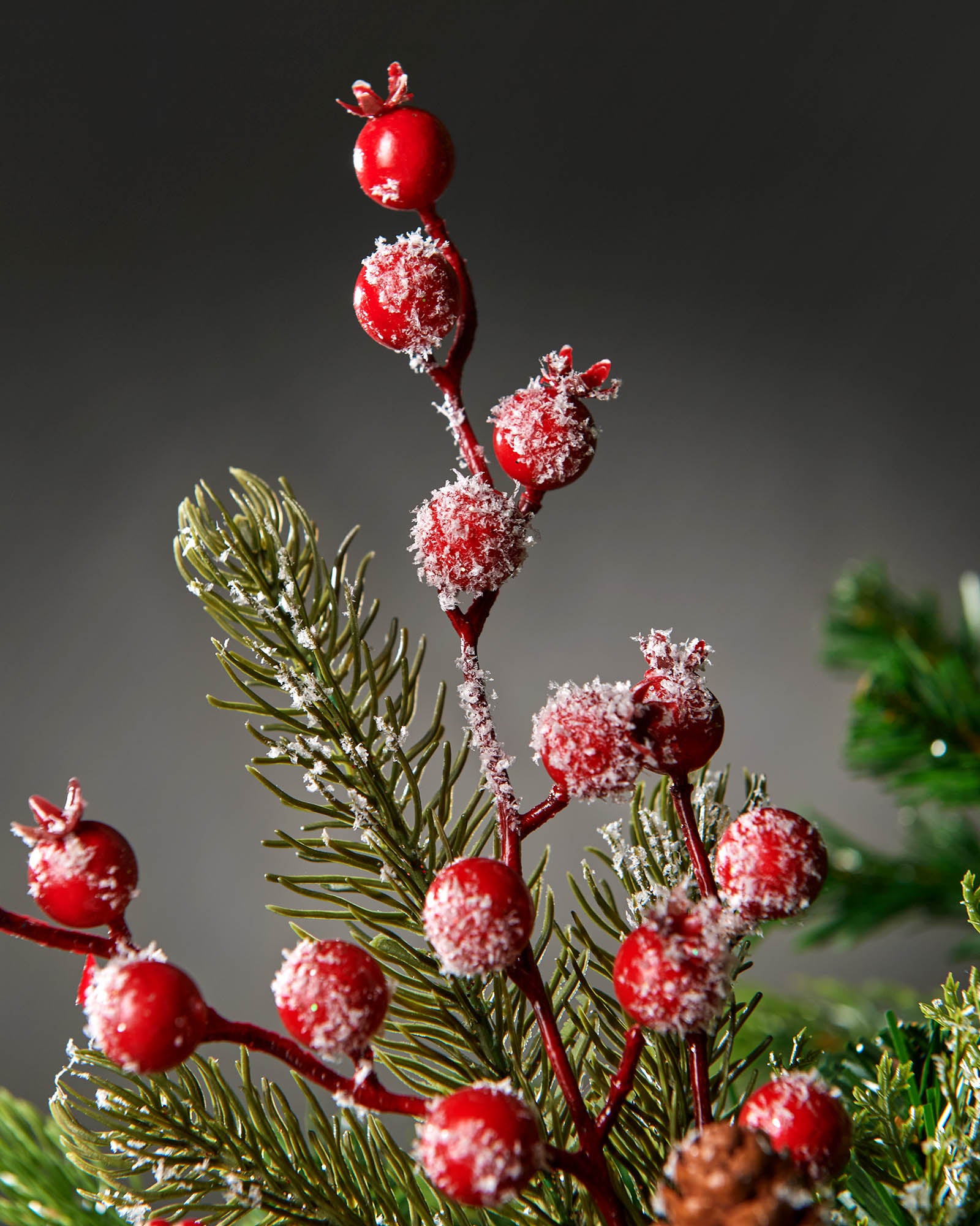 This frosted berries and pinecones pick brings a natural woodland charm to festive décor. Measuring 40 cm in length, it features glossy red berries, green pine foliage, and a brown pinecone, all finished with a frosted coating for a snowy effect. The wired stem makes it easy to place in Christmas trees, wreaths, garlands, or seasonal centrepieces. Lightweight and reusable, it’s perfect for adding texture and colour to your arrangements year after year.