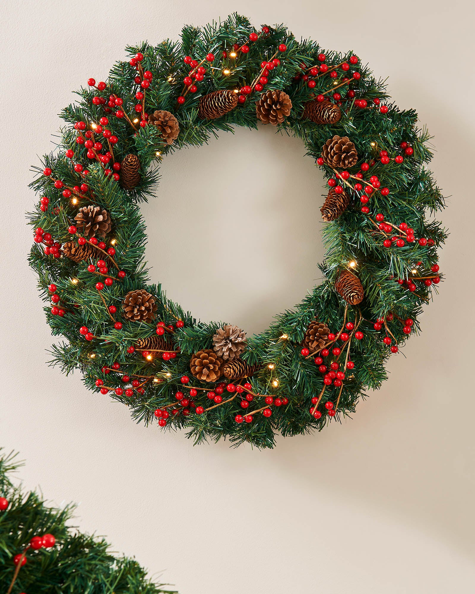 Pre-Lit Extra Thick Wreath, Pinecones & Berries, 76 cm