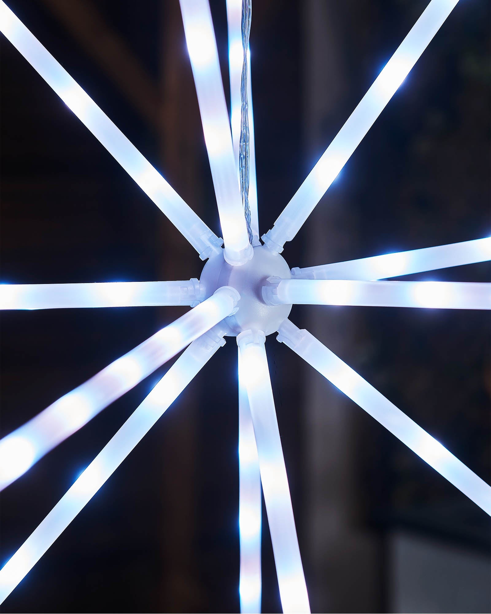 Add a dazzling centrepiece to your décor with this 56 cm RGB Hanging Starburst Light. Featuring 70 multicolour LEDs across 14 plastic tubes, each with 5 evenly spaced RGB LEDs, this design delivers a brilliant burst effect. Controlled via remote or smartphone using the QR-linked smart controller.