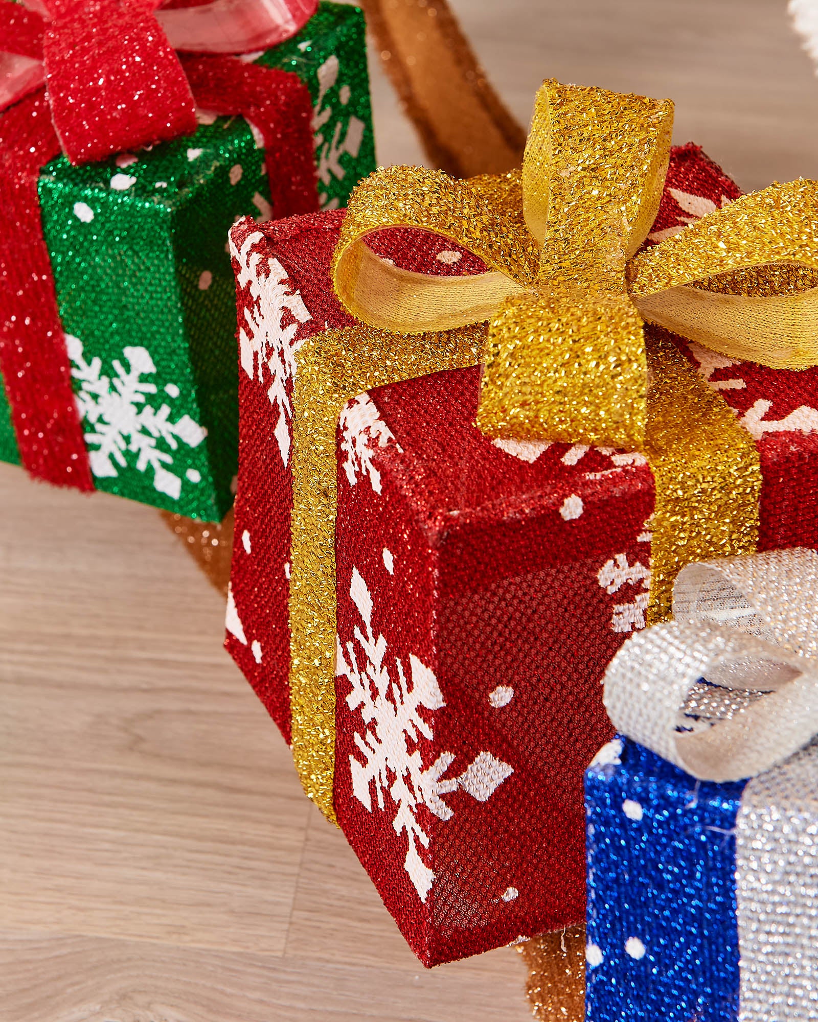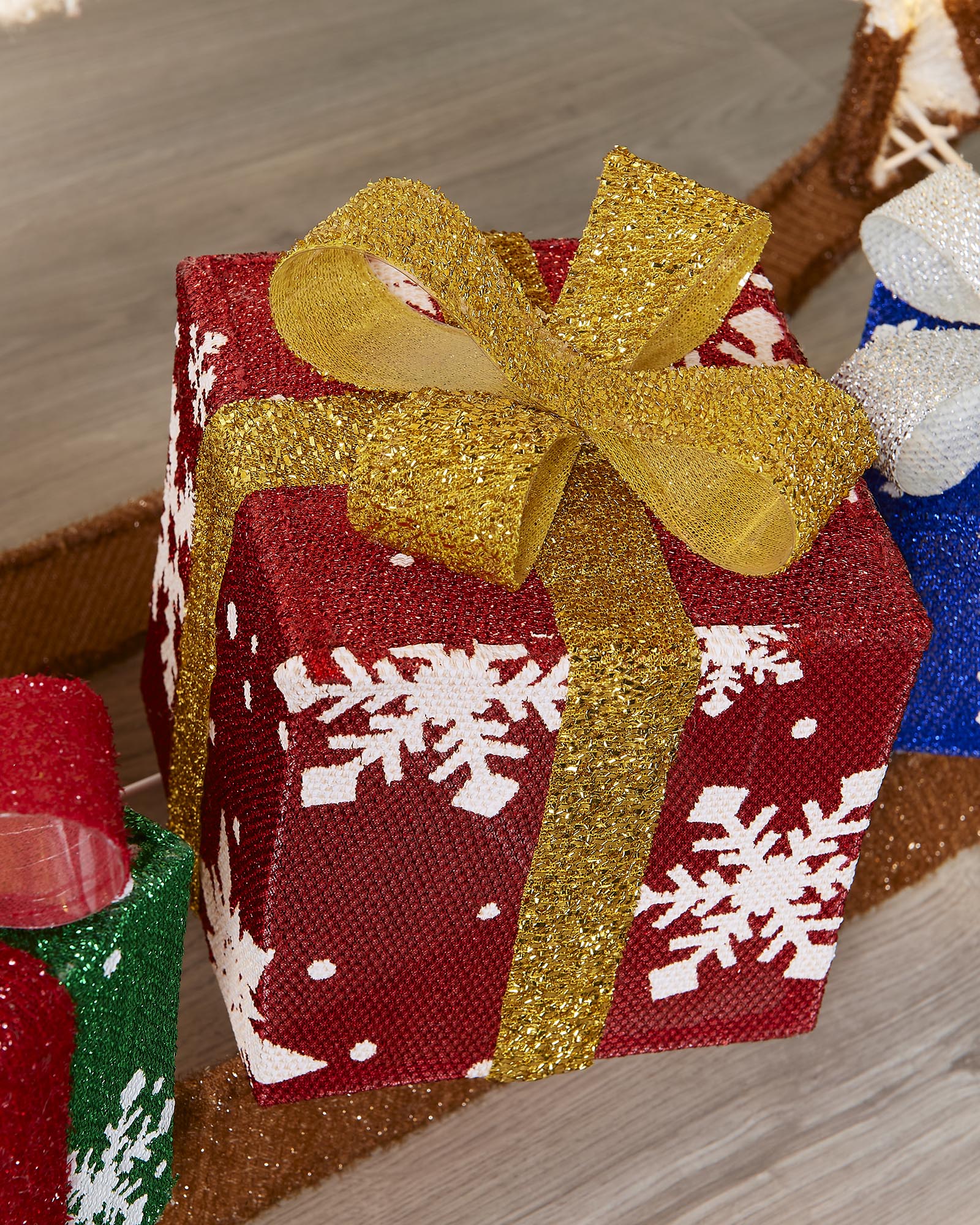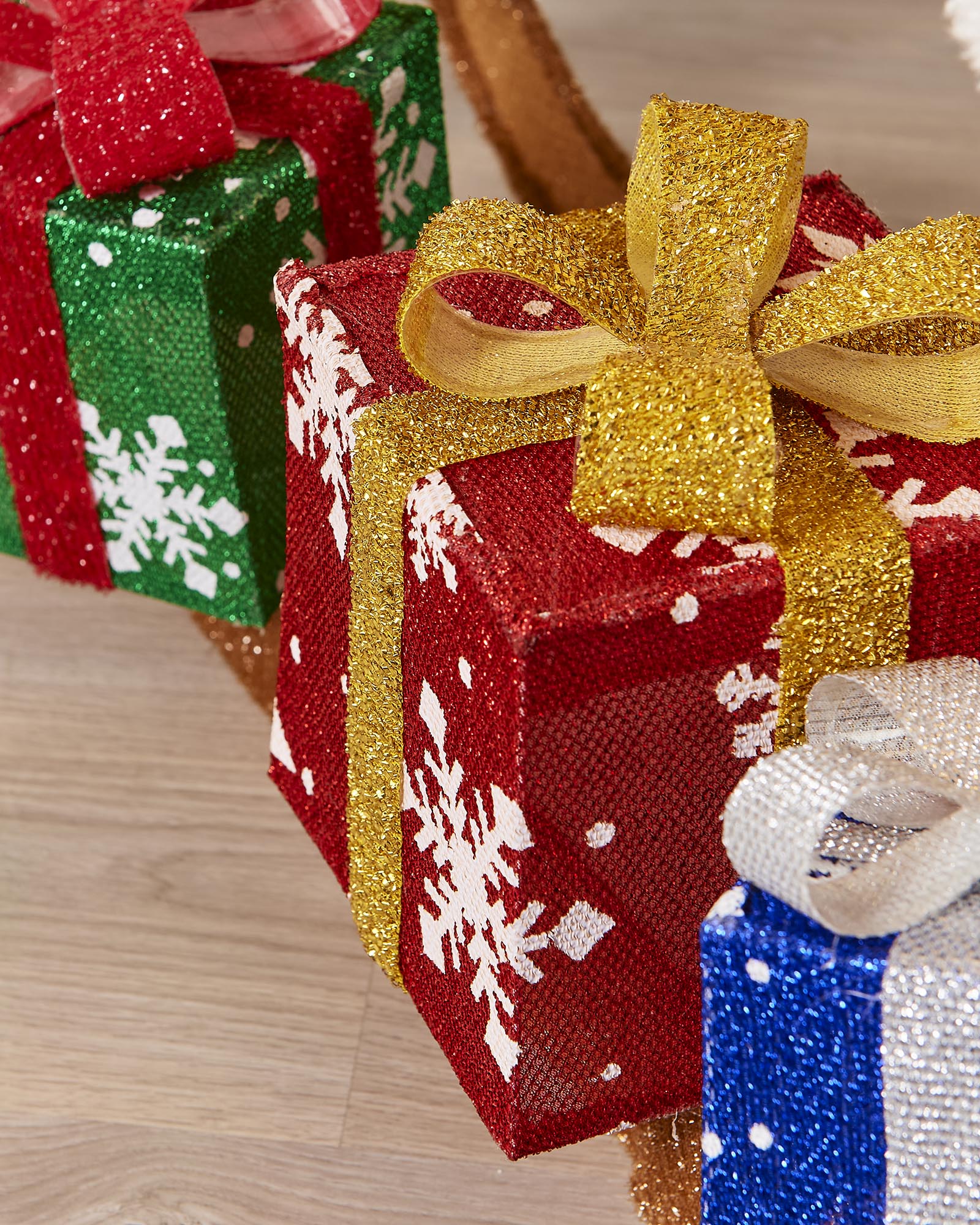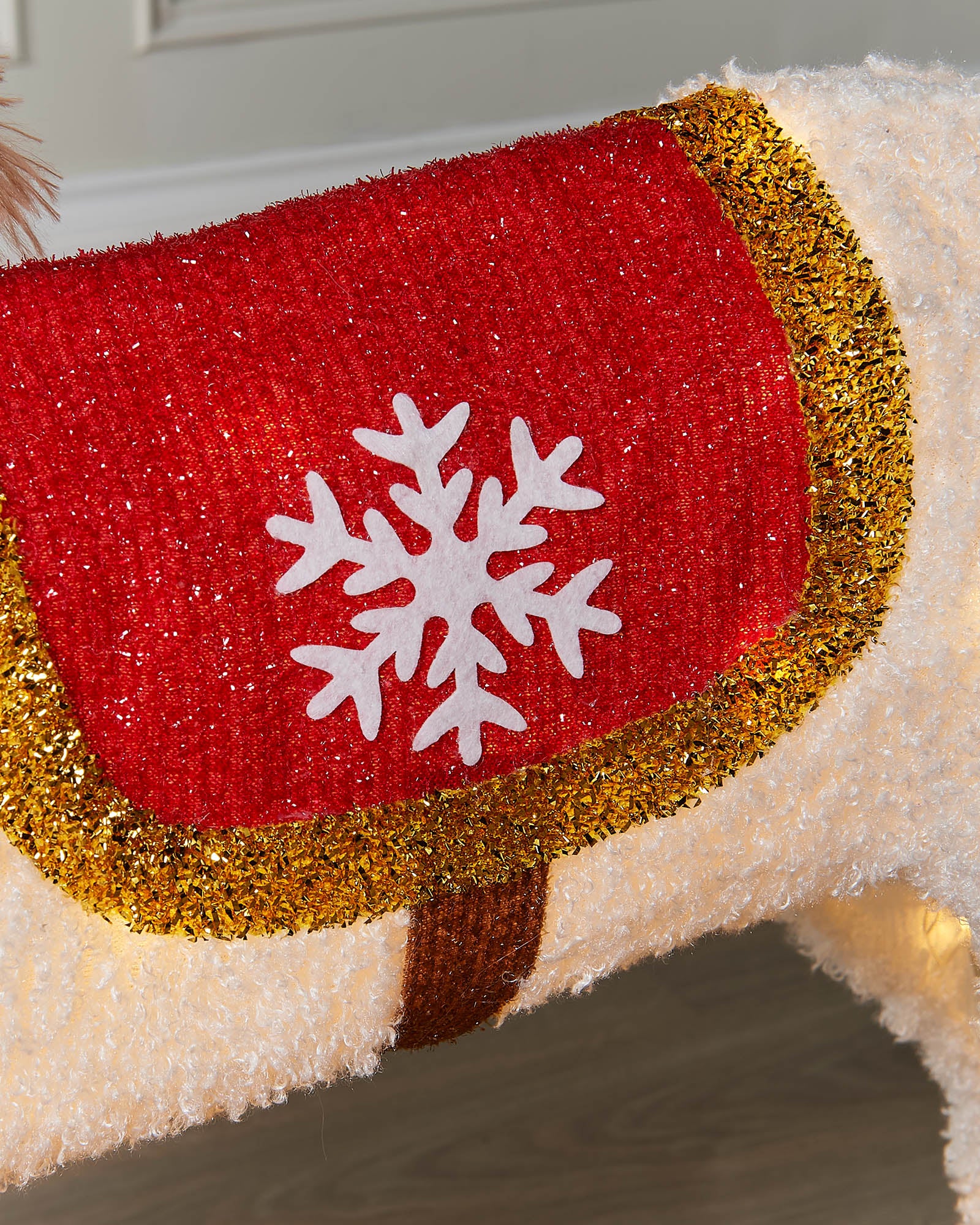 This 90 cm pre-lit 3D rocking horse silhouette brings a nostalgic charm to your festive display. The white horse features a brown mane and tail, a red harness, and a red saddle with a snowflake motif framed in gold trim. Resting on a golden-brown rocker, it is accompanied by three glittering gift boxes in red, green, and blue, each finished with ribbon bows.