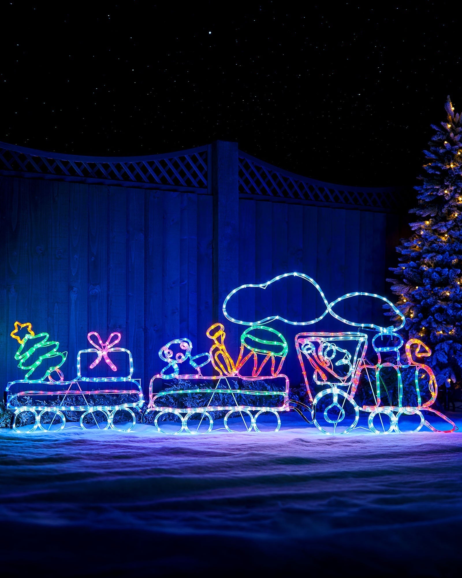 A freestanding train display lit with multi-coloured LEDs and animated smoke effects. The 2.3 m frame includes a built-in speed controller to adjust the flash rate, with memory function to retain your last setting. Each carriage includes moveable stands and folds flat for storage. Suitable for indoor or outdoor use, with a 3 m lead. Mains powered with a low-voltage transformer; plug must be kept dry if used outdoors.