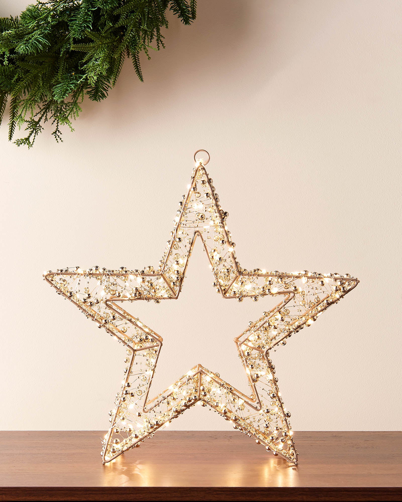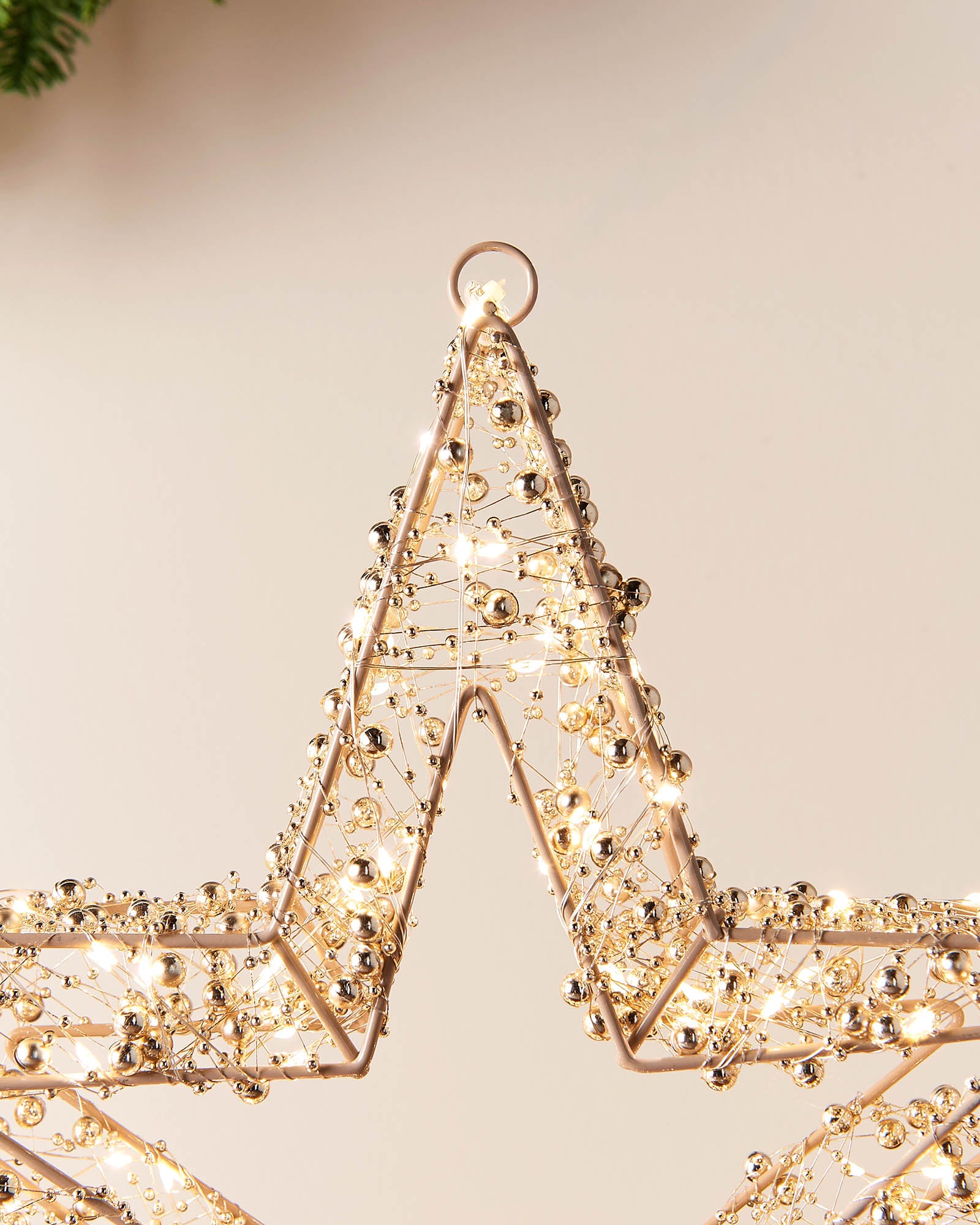 Bring a subtle glow and refined finish to your festive interior with this 38 cm pre-lit gold star. Its structured wire frame is wrapped in delicate gold beading, creating a soft shimmer as 200 warm white micro LEDs shine through silver copper wire.