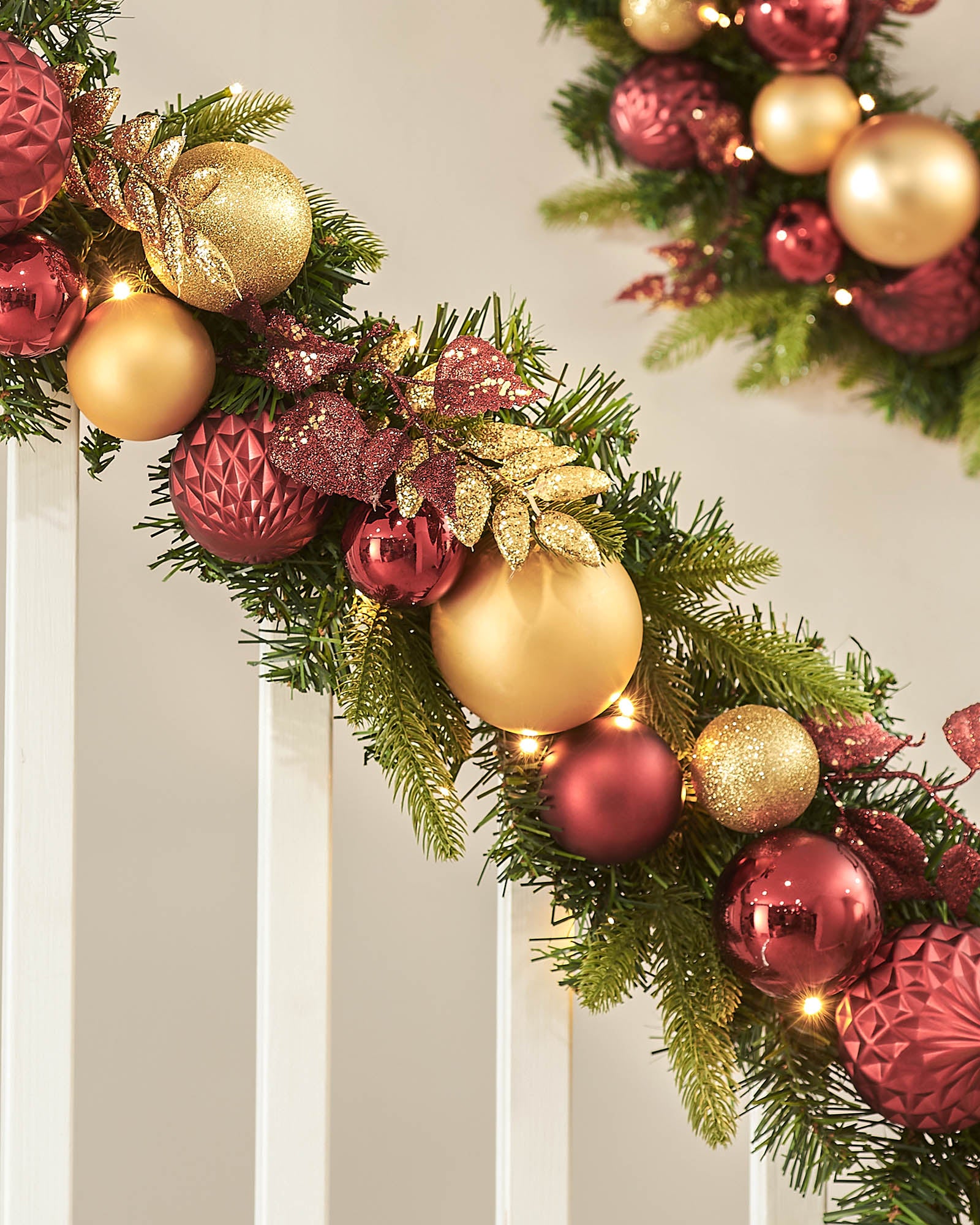 Add festive elegance to your home with this 9 ft Pre-Lit Bauble Garland in burgundy and gold. A rich mix of matte, gloss and glitter baubles adds visual depth and texture.