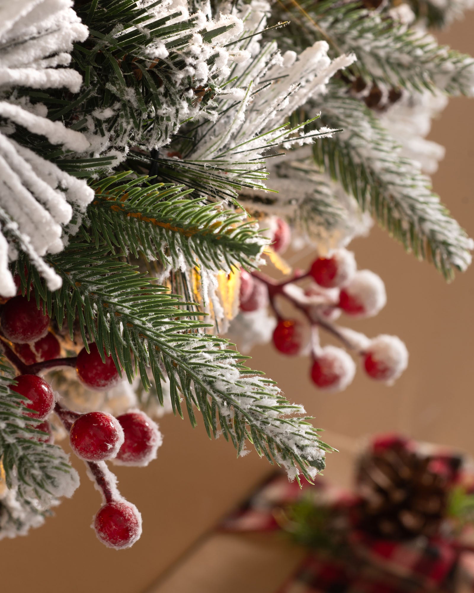 This 76 cm Pre-Lit Snow Flocked Extra Thick Wreath features 120 snow-flocked PVC tips adorned with red berry clusters and pinecones, creating a full and festive look reminiscent of a snow-kissed Christmas.