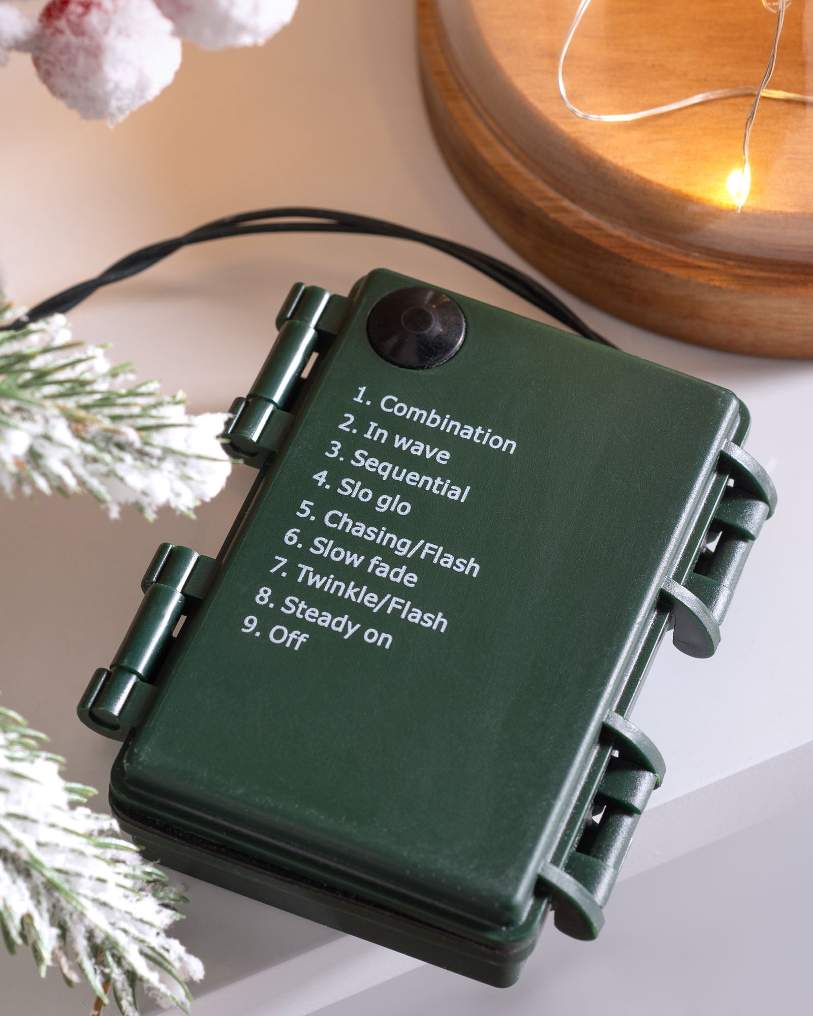 Equipped with 50 Warm White LEDs and an 8-function controller, it offers various lighting options including twinkle and steady glow. Powered by 3xAA batteries (not included) and includes a timer that runs lights for 6 hours then off for 18 hours.