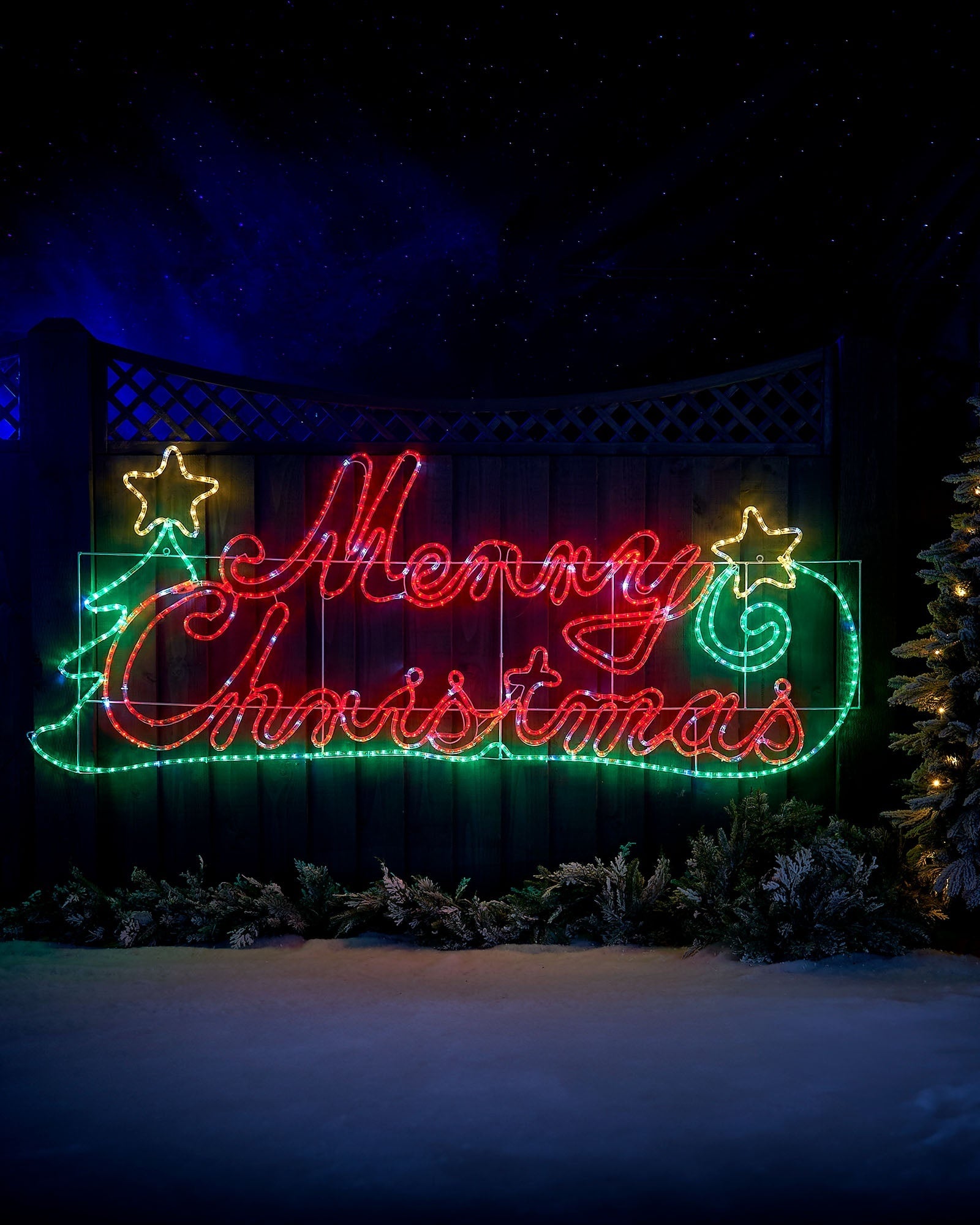 Add a festive focal point with this vibrant Merry Christmas rope light. Featuring 576 multi-coloured LEDs including 48 white flash effects, it offers a dazzling seasonal display for any setting. Its durable design ensures long-lasting use throughout the seasons.