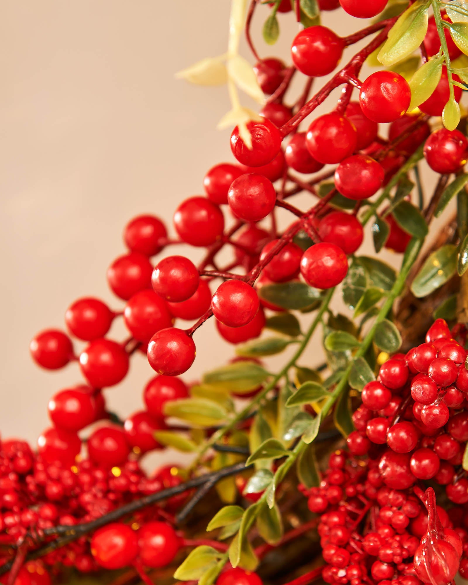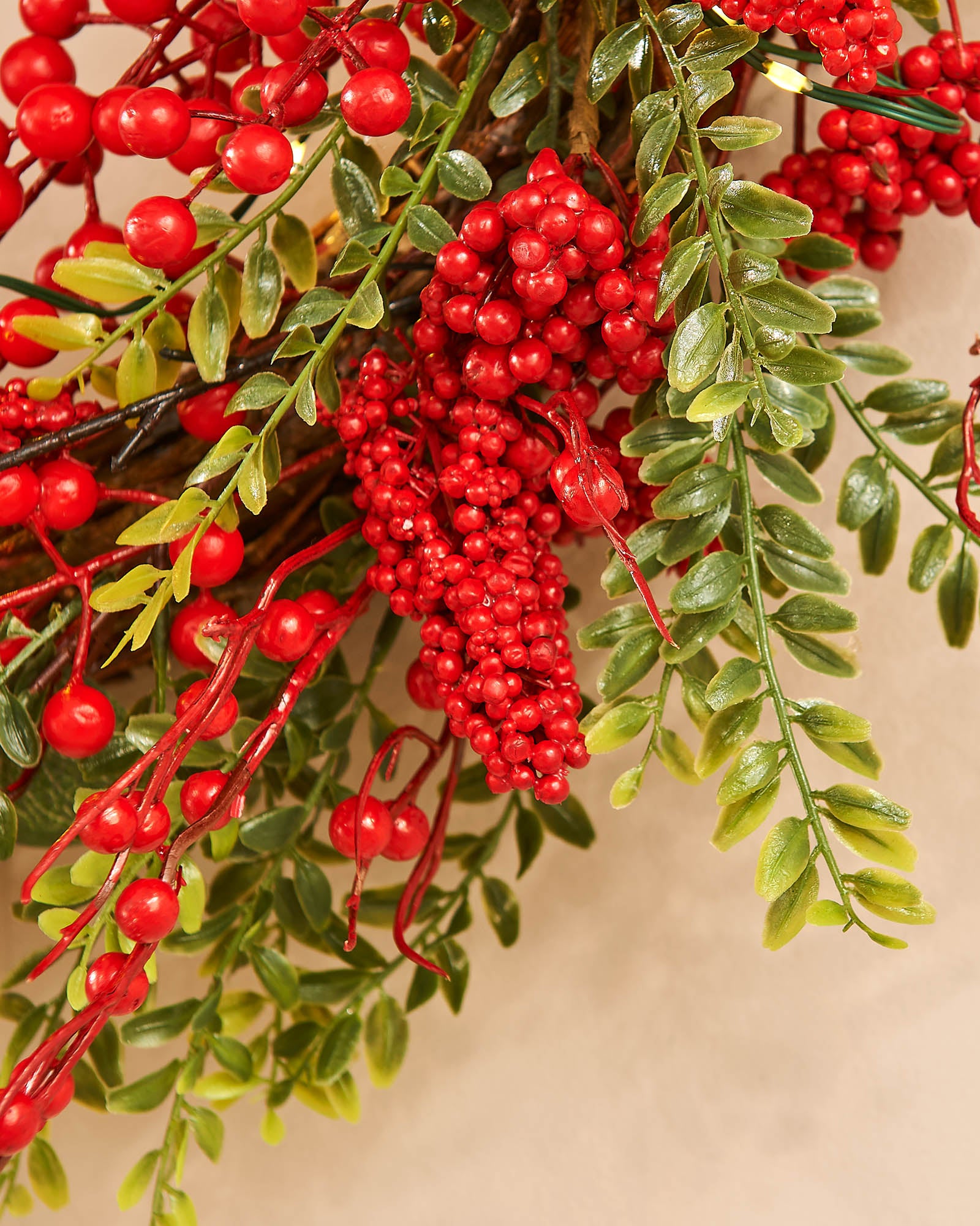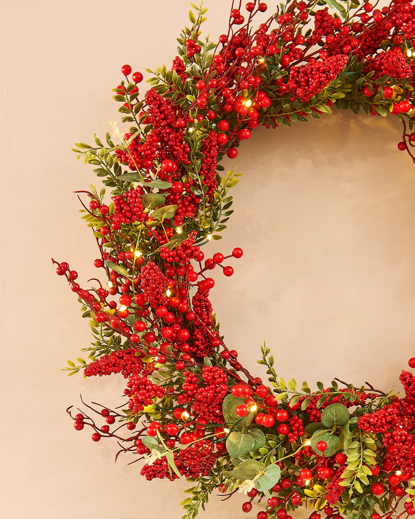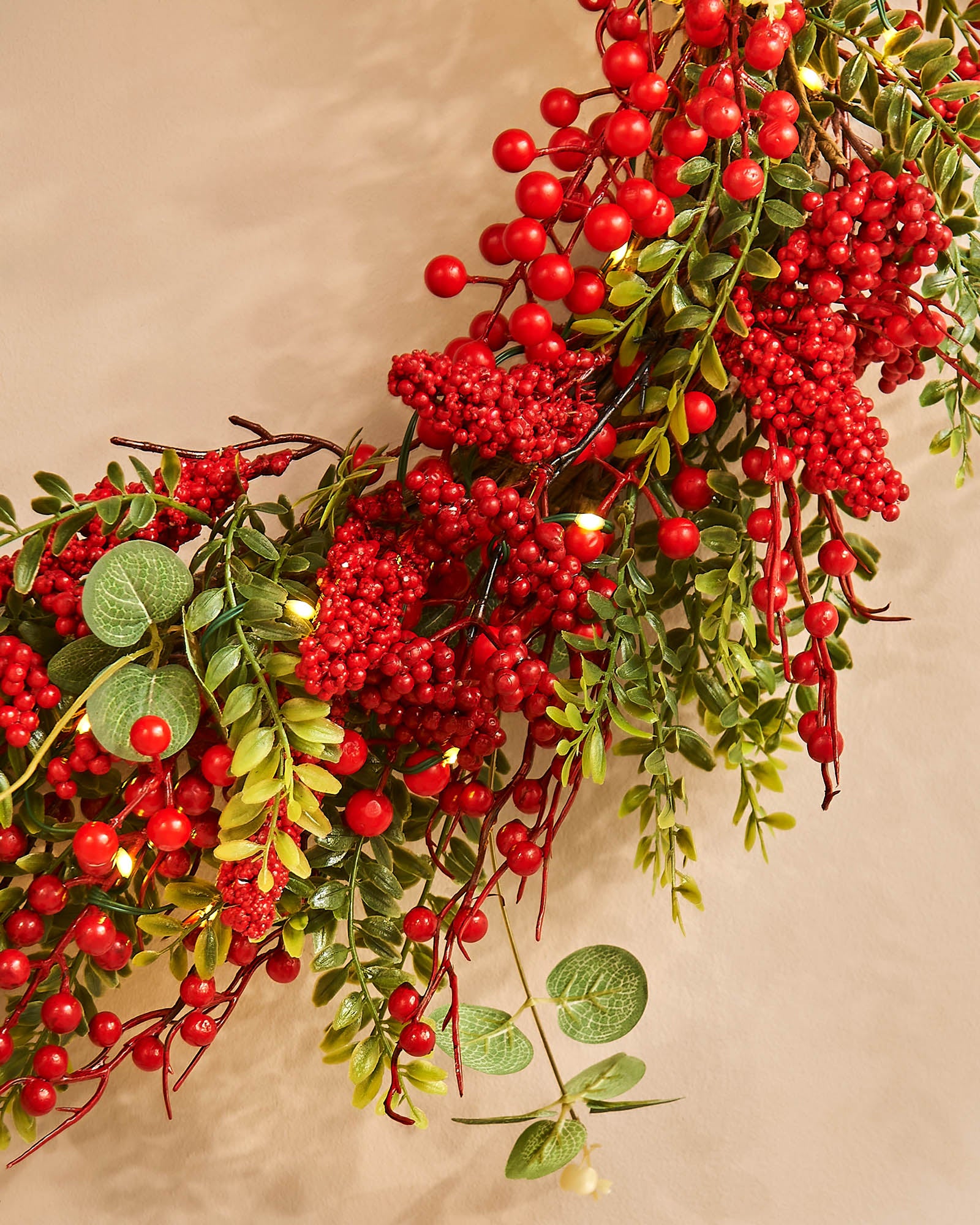 Make a vibrant seasonal statement with this 76 cm Pre-Lit Red Berry Wreath. Overflowing with rich red berries and layered greenery, it offers texture, colour and visual impact.