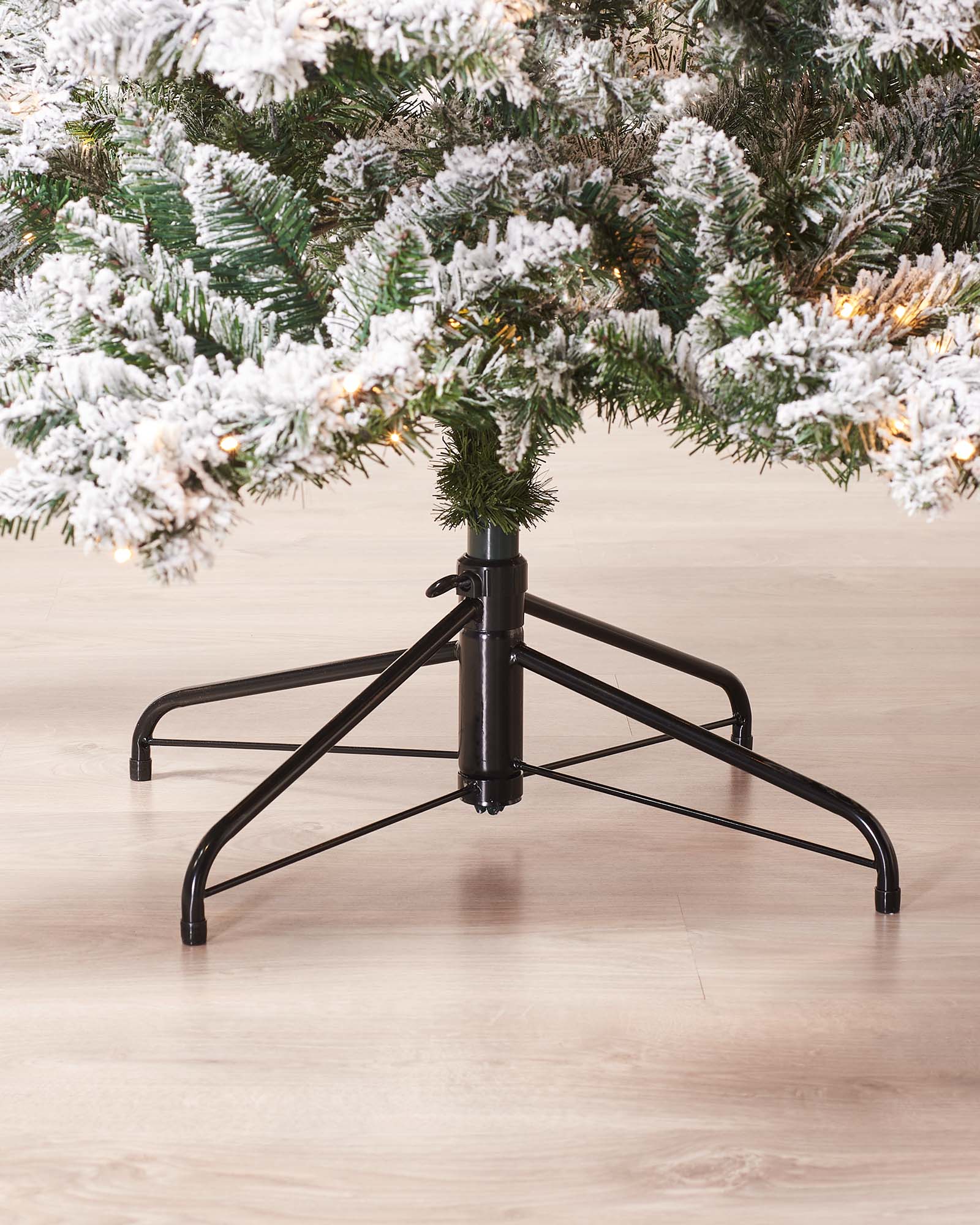 This 7 ft snow-flocked Alpine tree captures a woodland scene in a beautifully styled form. Featuring 1036 mixed PE and PVC tips arranged in a tiered, layered profile, it delivers a balanced silhouette—denser at the base, tapering gracefully to the top.