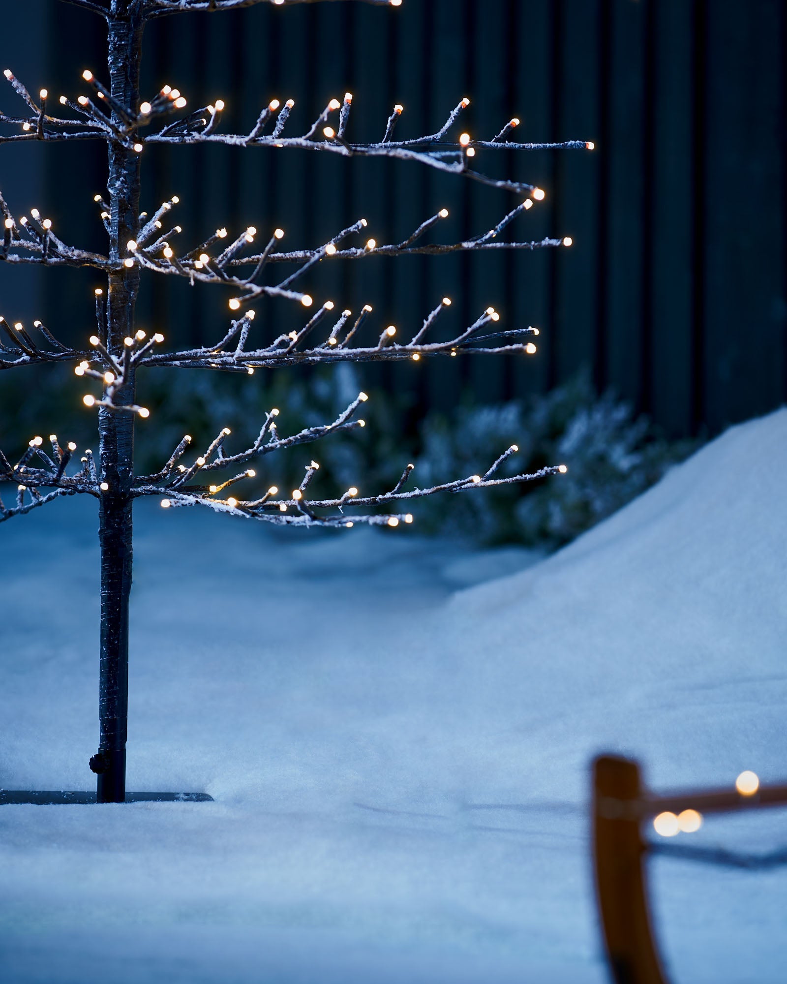 Pre-lit with 296 warm white LEDs, the tree offers eight lighting effects: Combination, In Waves, Sequential, Slow Glow, Chasing/Flash, Slow Fade, Twinkle/Flash, and Steady On. Includes memory function to resume your last setting. Mains powered with low-voltage transformer. Keep plug dry if used outdoors.