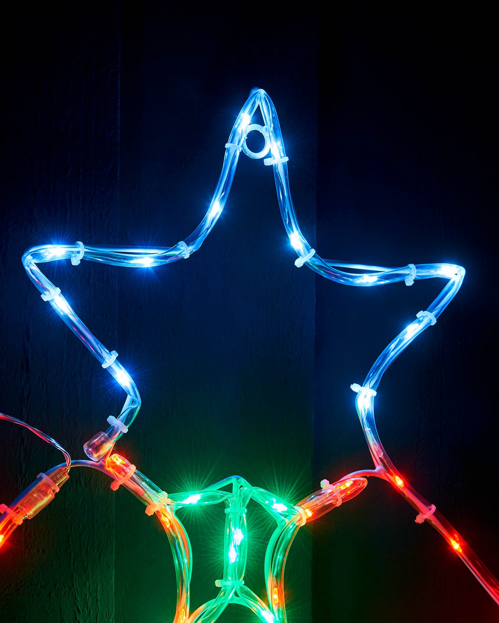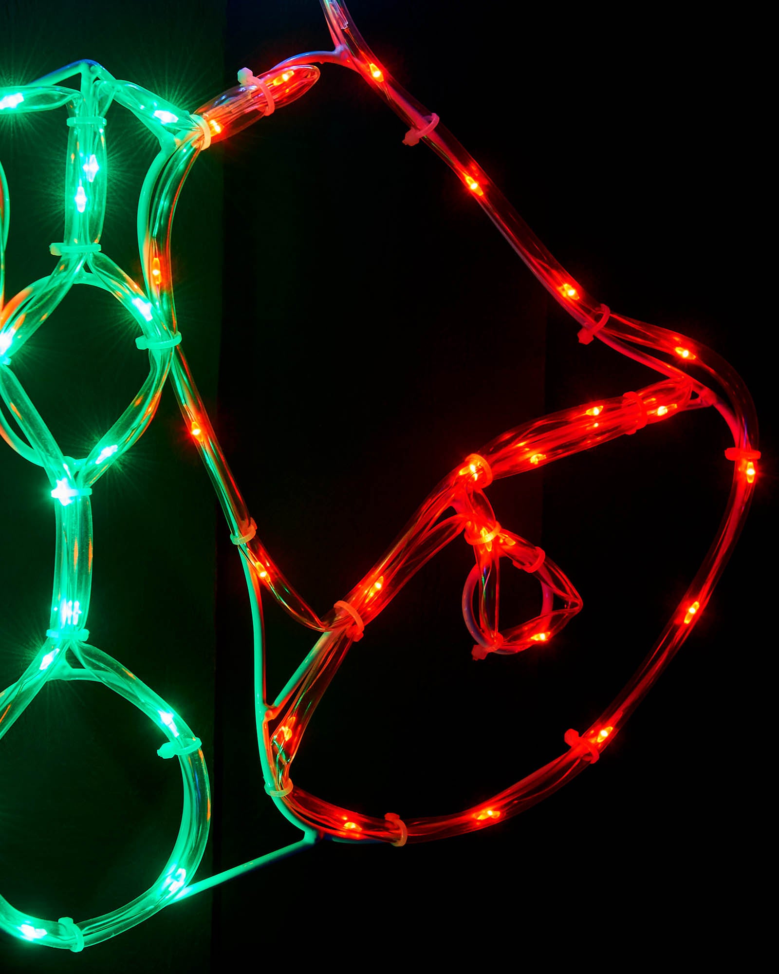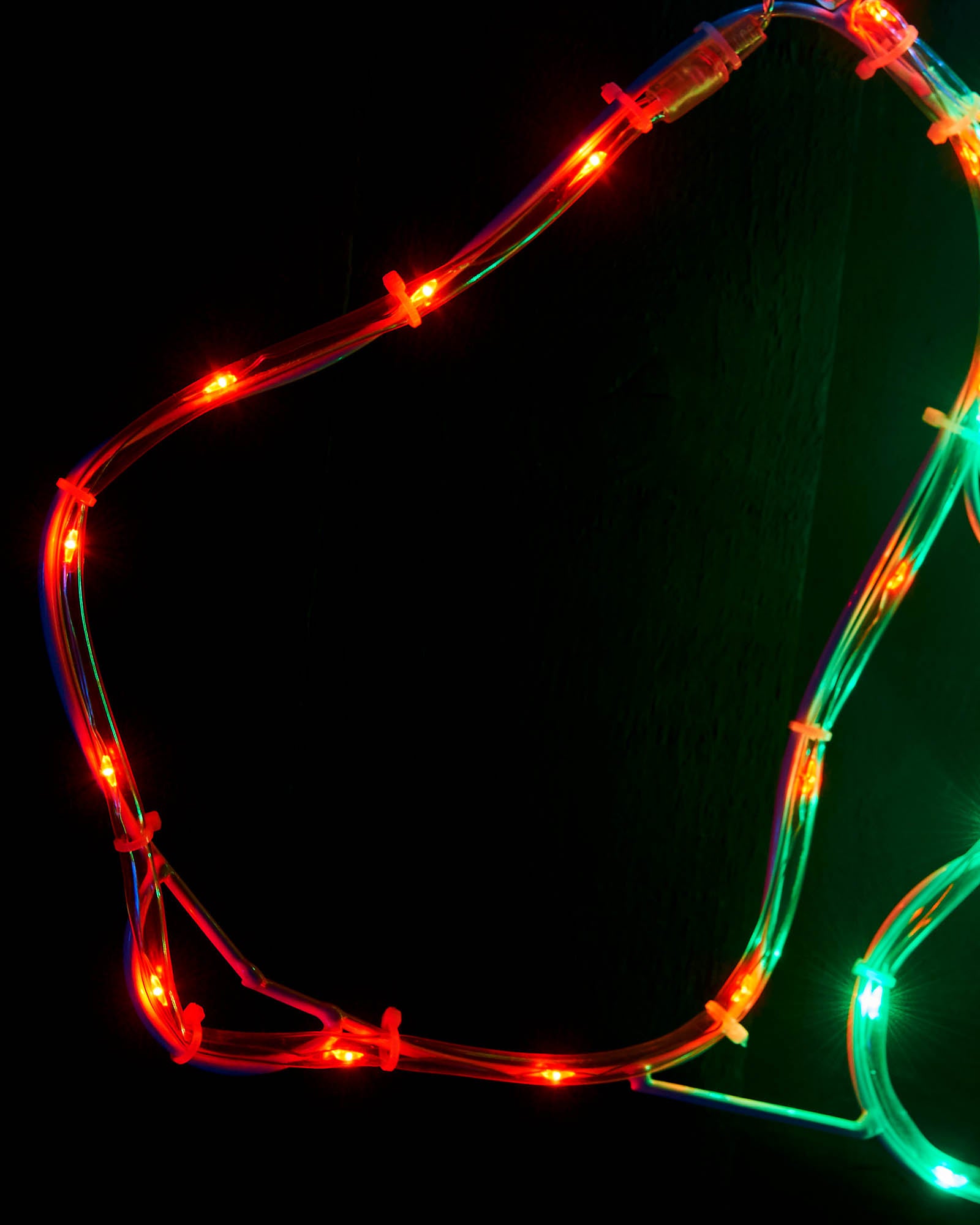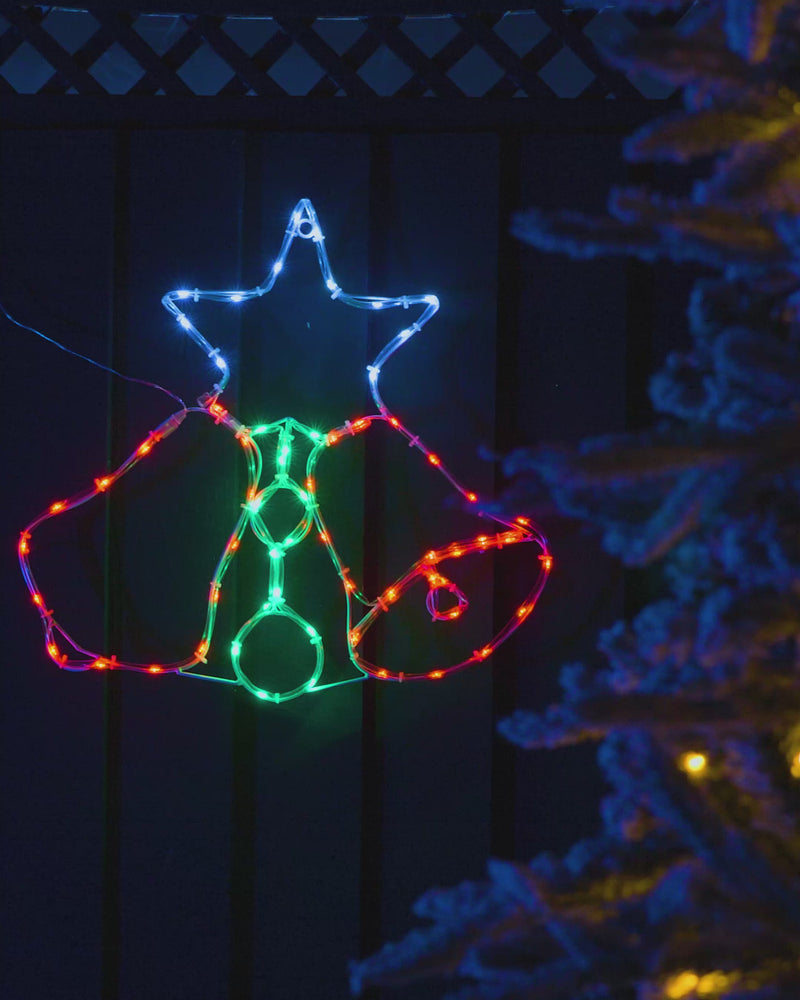 A festive addition to any display, this 48 cm twin bells rope light features two red bells beneath a green holly and bright white star. The design is illuminated by 67 multi-coloured LEDs across 3.18 m of tubing, mounted to a lightweight frame for easy placement. Suitable for indoor and outdoor use, it comes with a 3 m lead wire and mains- powered low-voltage transformer. Keep plug dry if used outdoors.
