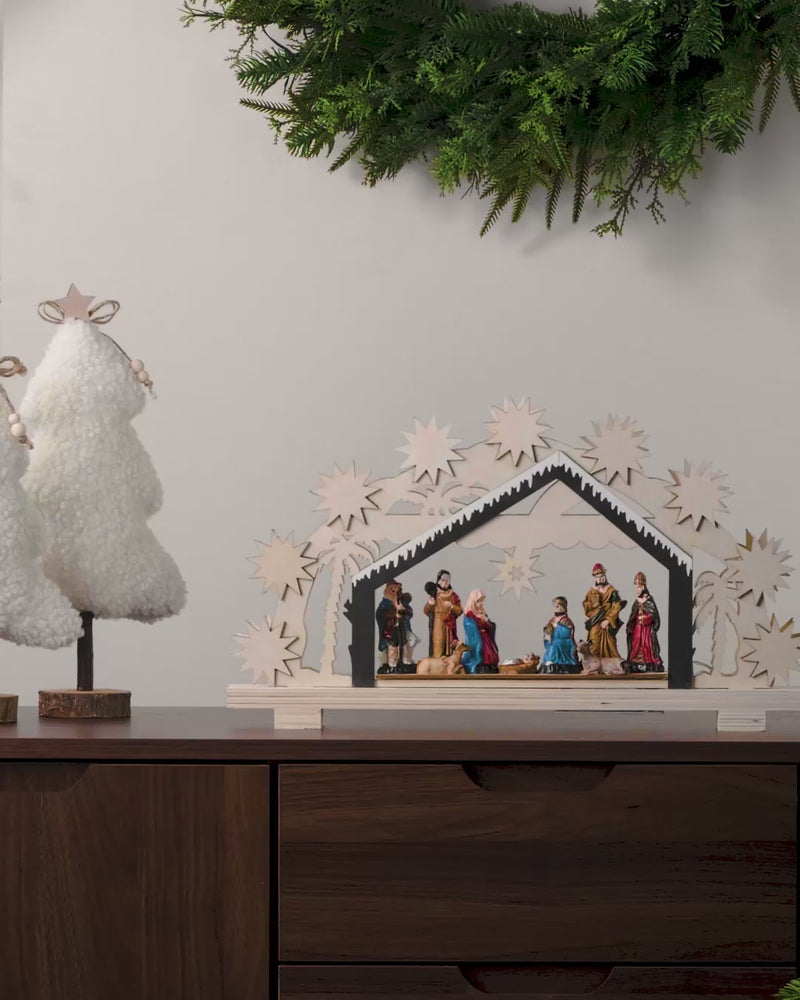 Celebrate the season with a beautifully crafted Nativity Scene, aglow with warm light.