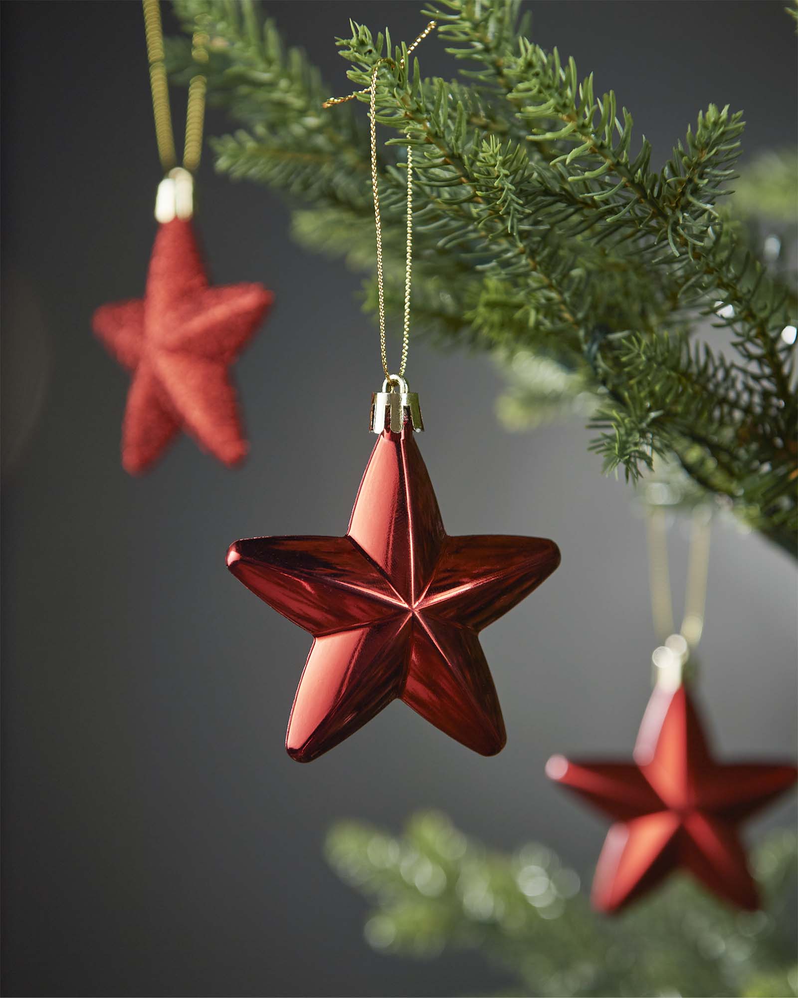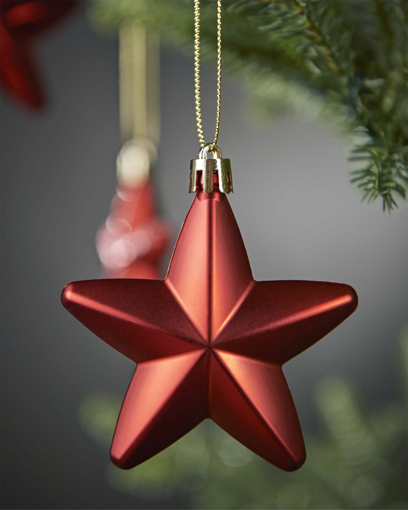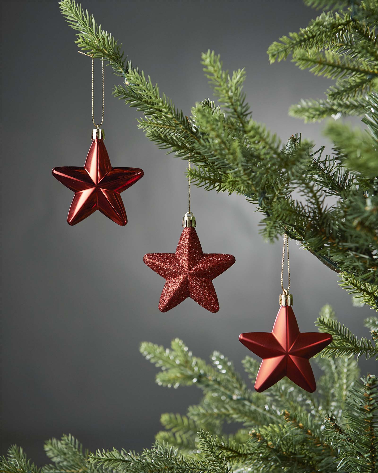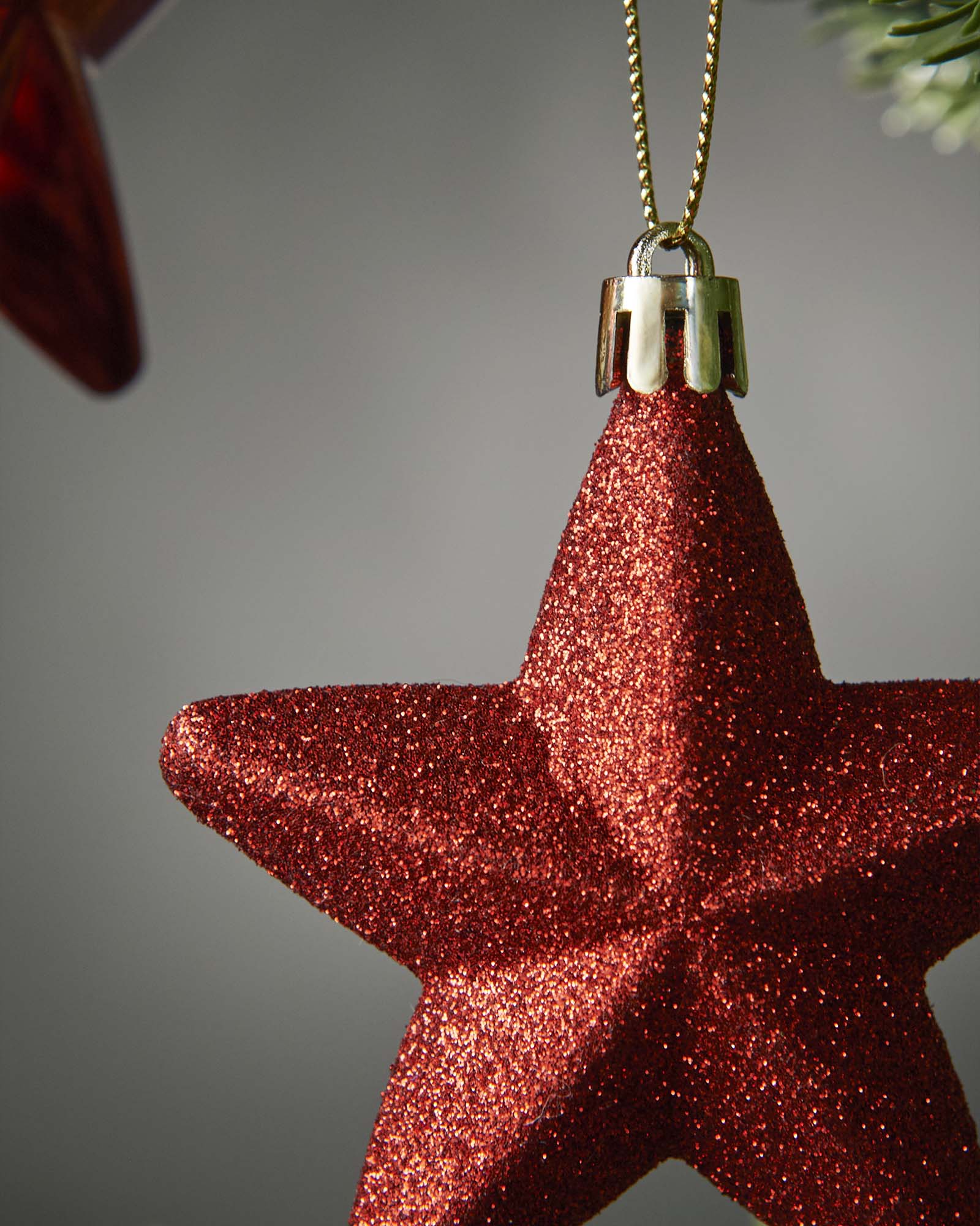 Add a refined festive touch with this set of 12 hanging stars, each measuring 7cm. The collection includes four shiny, four matte, and four glitter finishes, offering a varied mix of textures to complement your Christmas decorations. Each star comes with a gold hanging string included. Crafted with care, these lightweight stars are ideal for hanging on Christmas trees, wreaths, garlands, or as standalone ornaments.