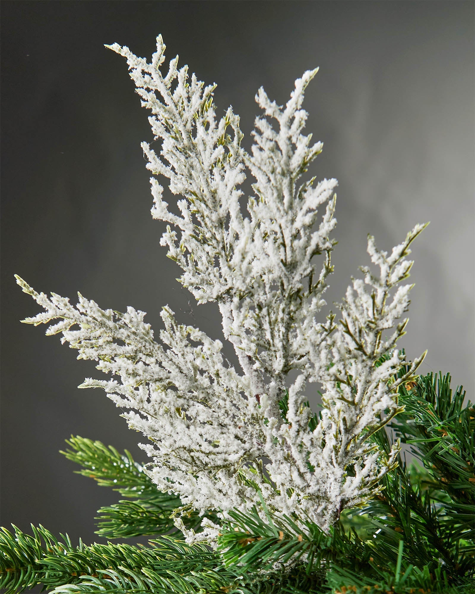 This pack of 5 snow-flocked cypress picks is perfect for adding a snowy, natural touch to festive décor. Each pick features 5 green cypress leaves with a soft white flocking effect for a freshly snow-dusted look. Measuring 40 cm overall, including a flexible 13.5 cm stem, they are ideal for enhancing Christmas trees, wreaths, garlands or table arrangements. Use individually to add subtle texture or group together to create layered, full seasonal displays.