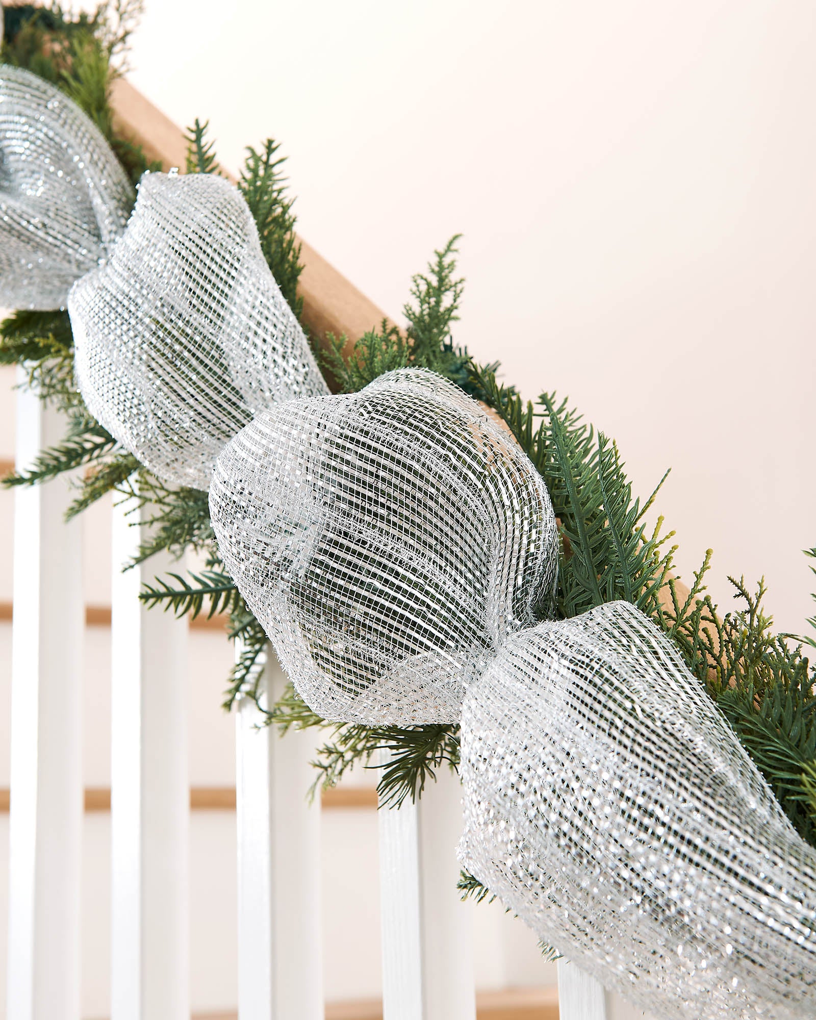 Create striking seasonal arrangements with this transparent mesh roll, boldened by thick silver foil stripes. Durable and easy to work with, this 9 m roll of 26 cm wide mesh is ideal