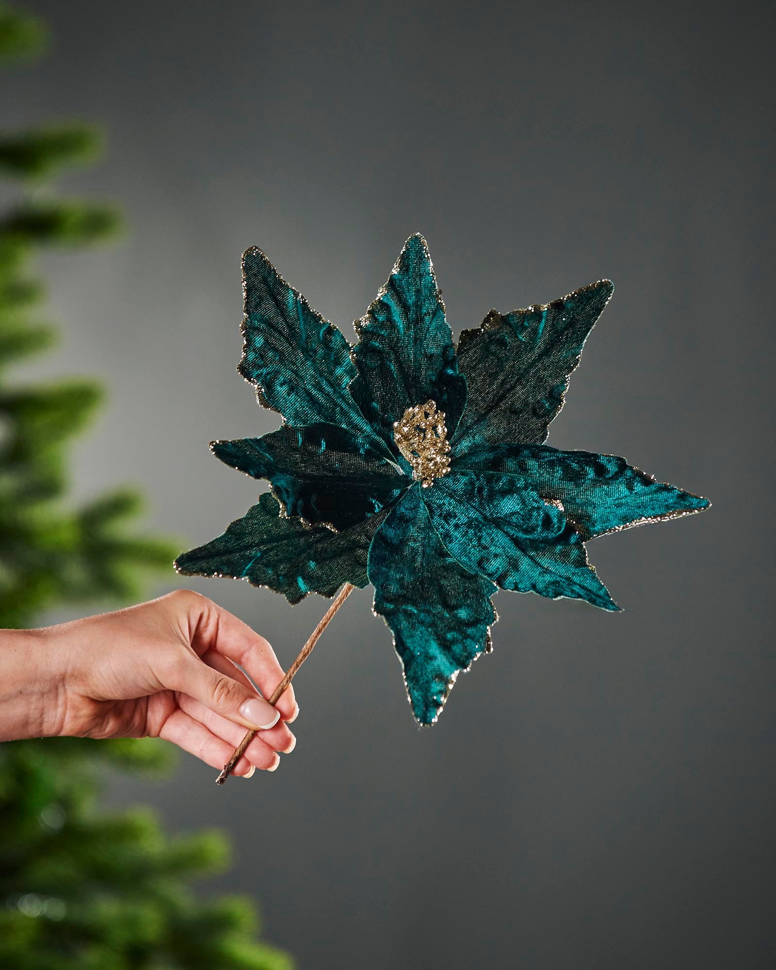 Add a bold splash of colour to your festive décor with this turquoise artificial poinsettia flower. With velvet-style petals in a rich jewel tone and fine gold glitter trim, it brings a modern elegance to wreaths, trees or garlands.