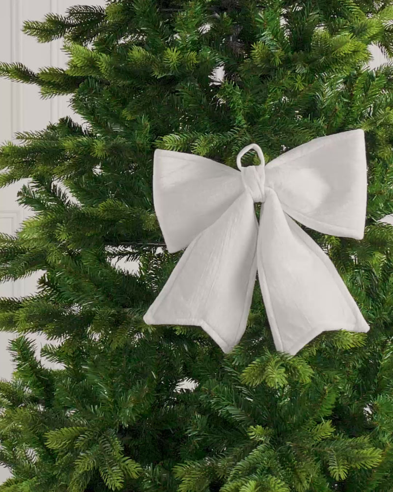 Elevate your festive décor with this vintage-inspired velvet bow in soft white, measuring 30 cm across. Crafted from plush velvet fabric with a wired edge, this bow holds its shape beautifully, allowing you to adjust the fullness and tails for a customised look. Featuring a hanging loop at the top and a dark green tie on the back, it offers versatile options for easy and secure display on wreaths, trees, garlands, or gift wrapping.