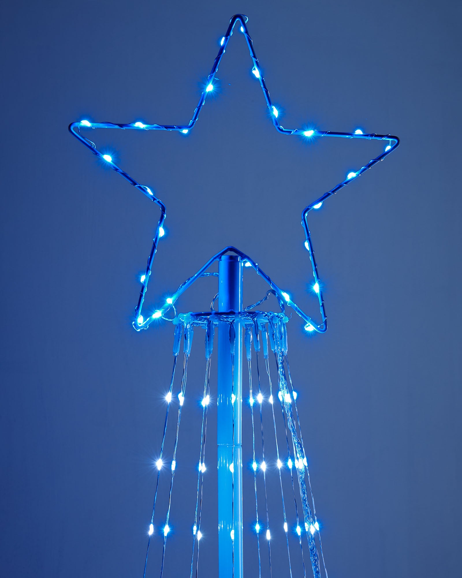 Create a striking seasonal centrepiece with this Waterfall Christmas Tree Light. Standing 2.1 m tall, it features a star-topped frame draped with 595 blue and white LEDs that cascade to a circular base. Includes an 8-mode controller for dynamic lighting effects, from waves to twinkle. Designed for both indoor and outdoor use with a 5 m lead.