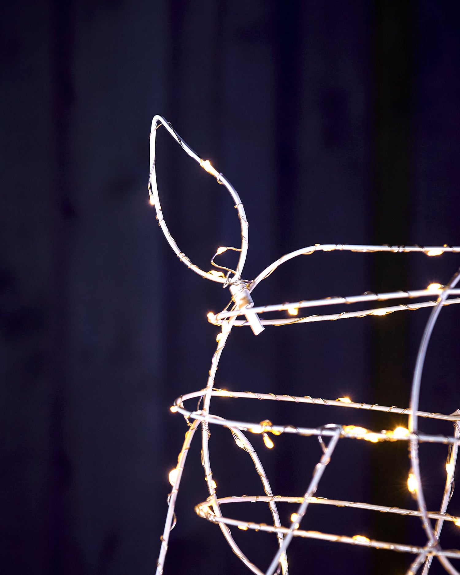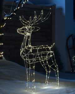 Add elegant structure to your festive setup with this 3D Grazing Reindeer Display, pre-lit with 200 warm white LEDs. Standing 81 cm tall and designed in three interlocking sections, the freestanding frame brings gentle shape to indoor or outdoor settings. Supplied with a low-voltage transformer, 5 m transparent lead wire, and optional ground pegs for stability. Keep plug dry if used outdoors.